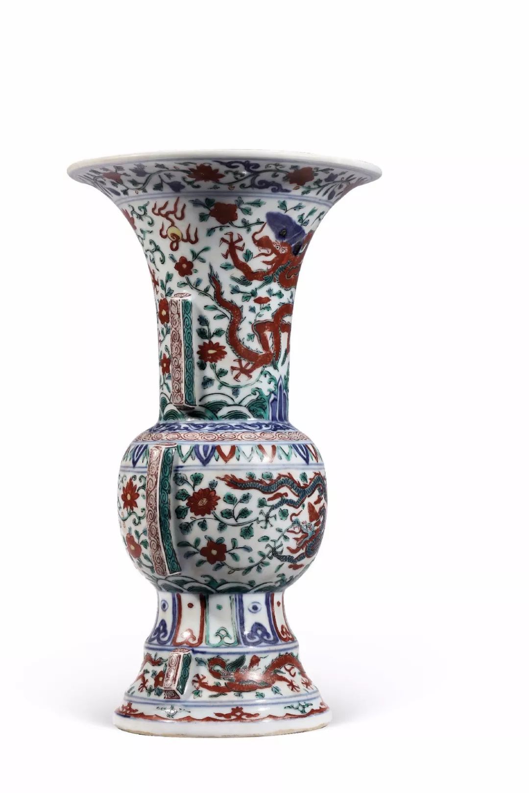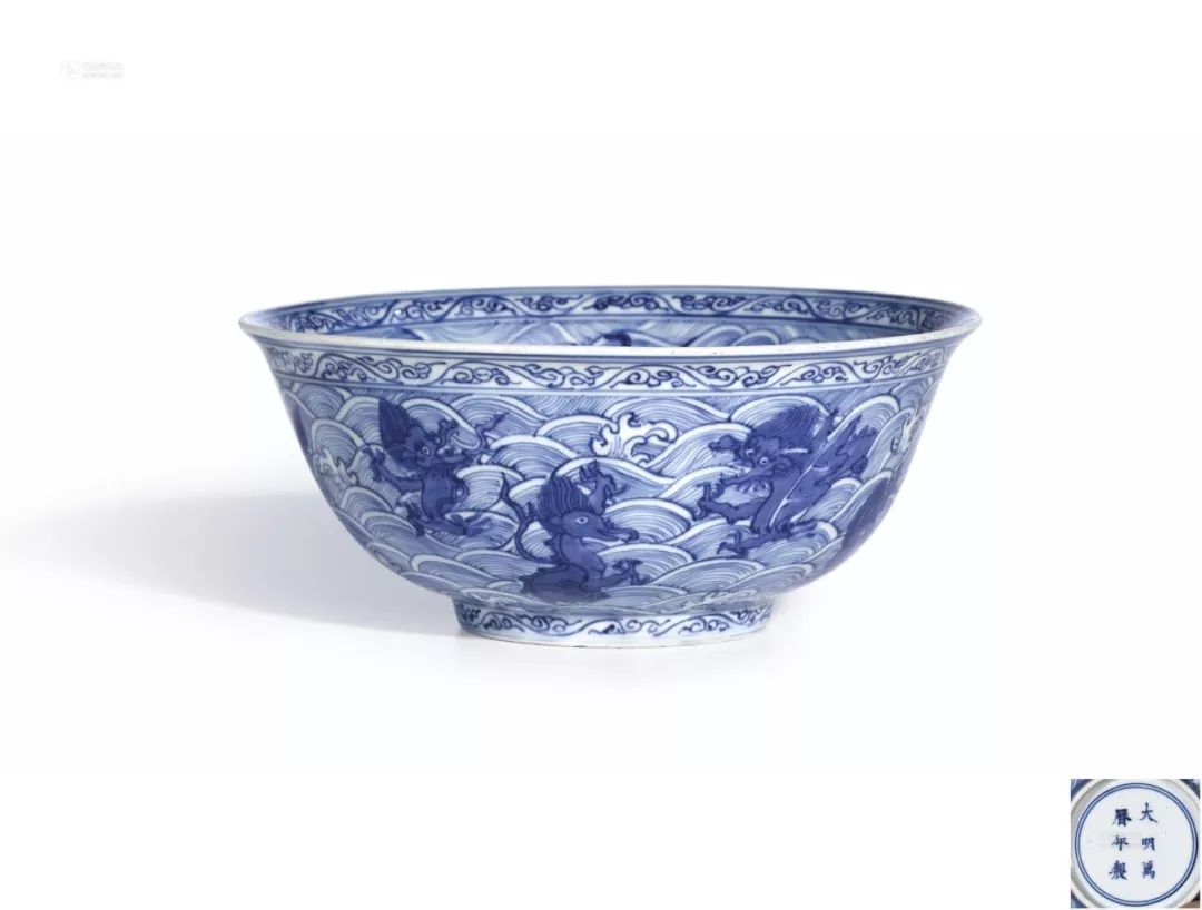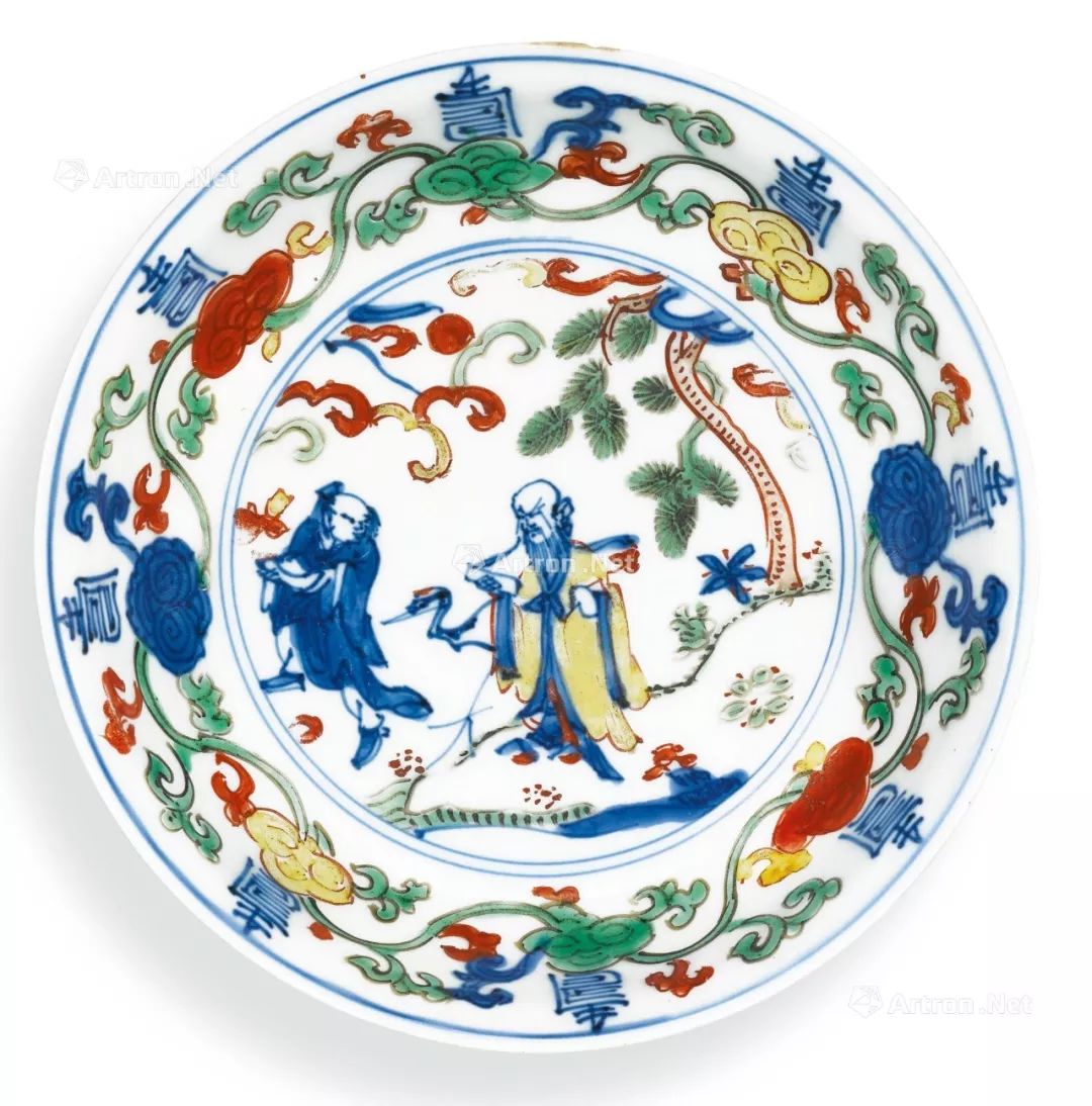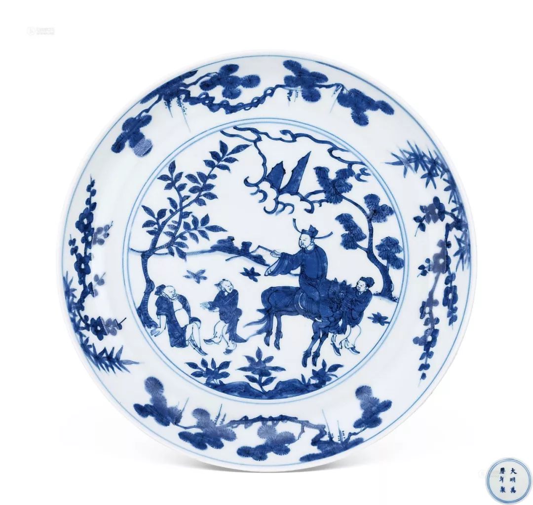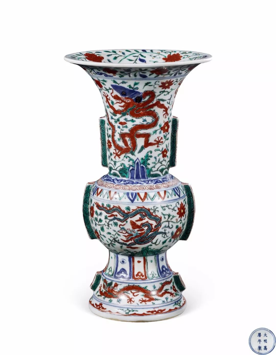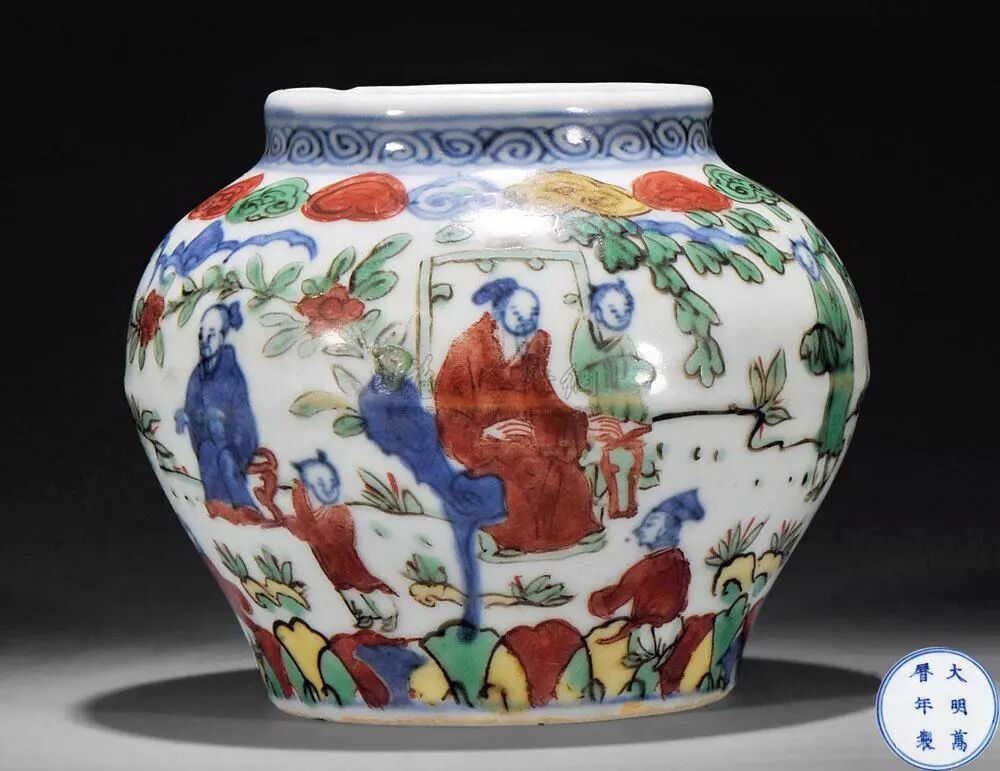此式青花五彩龙纹出戟尊当为其中杰出之代表,造型源于上古青铜器,朴拙古雅。整器呈花觚型,于颈部、腹部、底部两侧突起出戟装饰,口沿内外壁均绘五彩花卉纹,颇为特殊;颈部与腹部四面皆绘以五彩寿山福海腾龙纹,蛟龙姿势各异,升降交错,诸彩搭配之下倍觉威猛有神。底部圈足,内心以青花书“大明万历年制”款本品器型基本周正,无明显变形之虞,是为万历官窑不可多得之佳作。 另外,此造型的设计与纹饰的布局构图关系密切,例如本品在造型上分出六部分,设计者正是借助造型的变化为繁复的纹饰提供有效的过渡,每一部分均独立成图,彼此又相互呼应,从而达到纹饰虽然繁复致密,但整体构图层次清晰的效果。而造型新奇别致,装饰妍丽繁缛,造型层次丰富,集彩绘、模印、堆塑、浮雕诸项技法于一身,相互辉映,各见其妙,其装饰风格为万历一朝御瓷之罕见,当为万历御瓷花方尊之翘楚。市场流通中本类作品极为罕见,可查近似例极罕;市场流通中可见矾红地青花绘缠枝花卉之例,与青花绘花卉例若干,唯五彩出戟尊例不见。 瓶为半个葫芦形,以凤纹为主题。上腹绘双凤纹,穿梭于如意云纹之中,下腹绘凤鸟立于地面,置身于牡丹花丛及洞石之间,及三只小鸟飞动于空中。口沿与腰部分别绘蕉叶纹及如意云头纹,圈足饰卷草纹一周。背面颈部青花双长方框内青「大明万历年制」款,上覆荷叶,下承莲花。 此罐直口,椭圆形深腹,至底渐敛,圈足。通体满施白釉,釉汁肥腴温润。腹壁以青花为饰,肩部及胫部环饰一周变形蕉叶纹,形成上下呼应之势。中部主体纹样由两组姿态各异之孔雀组成,一只立于洞石牡丹之侧,一只回首顾盼,身姿袅娜,颇富神韵,其间点缀花蝶蜜蜂,皆各具情态,一派欣欣向荣之景。其青花描绘精细而生动,笔韵浓淡相间,层次丰富,尤以翎羽之绘饰写实传神。底心青花双圈内书「大明万历年制」六字双行楷书款。 孔雀作为瓷器纹样元代即已出现,而明承元制,瓷器纹样亦有延袭。大英博物馆藏一民窑嘉靖年间孔雀罐,大小及装饰纹样与本品相类,但整体做工与本品不可同日而语,仍可兹参照为时代之延烧。整器造型小巧雅致,构图布局疏朗,釉质甜润匀净,青花浓妍泛紫,描绘精细而不失工致,实为万历青花官窑不可多得之佳作。 杯撇口,弧腹,足靶起竹节式凸棱。外壁青花地留白纹饰,饰九只不同海兽浮游于海水中。高足饰海水纹,足节凸花如意纹。盌心饰八梵文围绕中间梵文。底青花双圈内书「大明万历年制」楷书款。如此器的万历款高足杯未见其他例子的着录。此款器源自宣德原型,台北故宫博物院收藏一件宣德款青花地白波涛海兽纹凸节高足杯。 盆胎体厚重,釉质光润,折沿花口,弧腹,平底。底部无釉一圈,底心内凹,书青花“大明万历年制”双圈双行六字款。此盆状若梅花,六瓣绽开,在明代宫廷档案原名称之为“梅盆”。外壁绘缠枝莲纹,内壁彩绘“满地娇”图。盆内壁及盘心均五彩绘姿态、颜色各异之鱼,水草浮萍漂浮摇曳,游鱼相互追逐,悠然自得,尤其盘心一尾青花大鲤由水中一跃而出,富具动感。 此器五彩彩绘华丽繁复,红绿二彩浓研相应,青花明丽泛紫,构图古拙之气尚存未脱,颇具意趣,深有万历年间五彩此器之风貌。万历五彩素负盛名,以红绿二彩炽烈取胜,《陶雅》云“万历五彩,草昧初开,往往显其拙相……皆非寻常匠手所能企及。”本品当为代表。 罐唇口,短颈,丰肩,腹下渐敛。外腹以青花留白技法绘百鹤祥云图,多数仙鹤昂首展翅朝左上飞翔,少数回首顾盼。底涩胎,中心内凹白釉,青花双圈内书「大明万历年制」楷书款。嘉靖、万历二朝崇尚黄老之道,鹤因寓有福寿之意,故成为当时最盛行的纹饰之一。 本罐线条饱满,敦实可爱,通体纹饰以釉下青花结合釉上五彩绘就。腹部主体分绘二图,一侧为相会图,庭院之中,主宾对坐交谈相欢,身边各立随仆;另一侧为课教图,芳园之中,塾师端坐讲授,学童伏案疾书,另有二仆托物侍立。整器所绘人物形神俱佳,笔法古拙,稚气未脱,颇具意趣。画面设色华丽炽烈,红绿二彩浓妍相映,青花幽丽匀净,黄彩璀璨夺目,其用色之巧妙,已至出神入化之境,深得万历五彩之精髓。 有明一代,佛教深入社会政治生活,反映在宫廷用瓷方面则是大量装饰着藏传佛教色彩的器皿自永乐朝起被烧造,如僧帽壶、梵文高足杯等,此莲花形盘即其中之一。莲花于佛教教义中象征“出于浊世,无所污染”,此盘拟取莲花为形,设计精巧,口内莲瓣的凹面有双勾垂云纹。盘心环饰两圈如意云纹,间以弦线相隔,中心书梵文。外壁上层莲瓣内画八朵折枝花卉,间以八个梵文相隔。下层莲瓣尖部画出叶脉纹,根部留白,显出莲瓣绽放之态。其釉厚润如玉,青花发色明艳,底部青花双圈内楷书“大明万历年制”官窑款识。其功用当为佛前供器,在密宗的理念中,该器所书的梵文为种子字,以草木的种子比喻佛、菩萨形象,写有梵文经咒和种子字的器皿是具有一种加持力,能得到佛法的保佑,加速修炼佛法的进程,此盘当为万历宫廷崇信佛教的一例佳作,国内外重要博物馆均有类似器物收藏,可作参照。 此器是迎合万历皇帝增寿的意愿而烧造的大器,缠枝莲托“寿”字组成“百寿图”,甚为别致。万历时期的青花百寿纹大罐沿袭了明嘉靖朝同类品种的装饰纹样,可参见《故宫博物院藏文物珍品大系—青花釉里红》中,页115,图105。但将开光内篆书寿字改为团寿