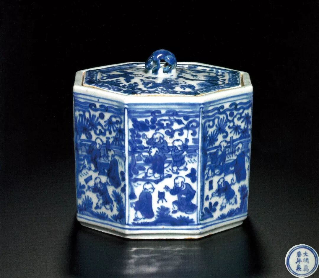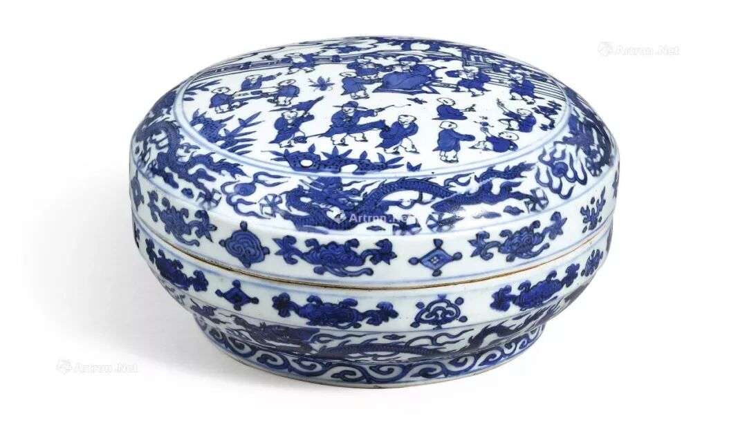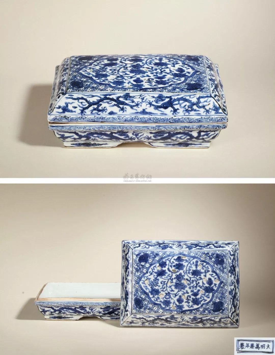 万历一朝,内府所出御瓷制样皆是百般奇巧,或玲珑,或方器,或大缸,往往竭众匠之力尚难为之,更有烧造难成之苦,百中不得一二之虞。本品制作工艺复杂,盖顶设计精巧新颖,花饰繁复多变,盒身外壁与盖顶下方均饰四组云龙赶珠纹,中央菱花形开光内装饰莲花八宝纹,外绘棱格锦纹。八吉祥图案与莲纹交错分布,中心则是一朵盛开的莲花承托法伦,显得雍荣华贵。盒面构图新颖别致,繁而不乱,层次清晰,八吉祥图案巧妙地分布于八瓣形盒上下,间以缠枝纹,错落有致。盖盒底部于四隅分承四足,形制精妙,器底双框内青花书 “大明万历年制”六字楷书书写朴拙有力,章法自然。 本品构图设计颇见匠心独具,纹饰虽繁缛而不乱,镂空工艺的运用令层次丰富清晰。镂雕是万历官窑热衷使用的装饰技法,然烧造极为不易,往往导致器物疵裂变形,为当时窑业之大患。《明神宗实录》载,万历十二年(1584):三月己亥“工科都给事中王敬民极言瓷器烧造之苦与玲珑奇巧之难。得旨,棋盘、屏风减半烧造。”然本品器型周正,无变形之虞,笔意稚拙可爱,所见云龙飘逸灵动,极具神采,自有万历时期粗犷之风格。青花一色秾妍泛紫 ,胎体厚重坚致,釉汁肥腴温润,是为万历官窑不可多得之佳作,传世罕见。