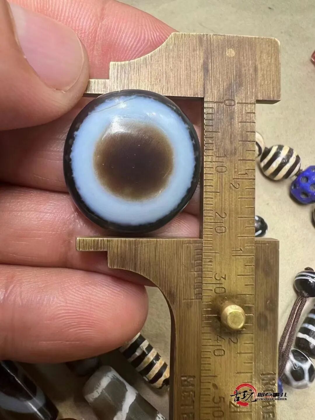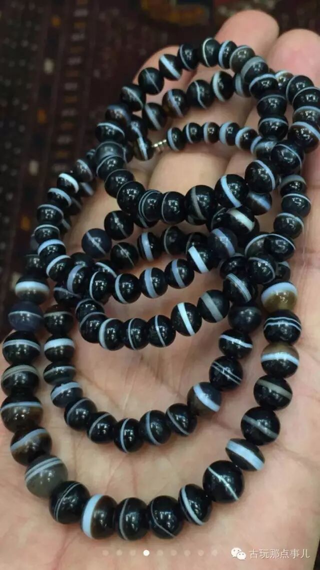 标准的药师应该是黑色或深褐色底色的玛瑙上,居中一条白线。药师珠应该以底色深、白线规整而粗,颜色对比强烈,个头大为好。药师珠就是玛瑙珠,所以可以按照鉴别老玛瑙珠的方法看药师珠。