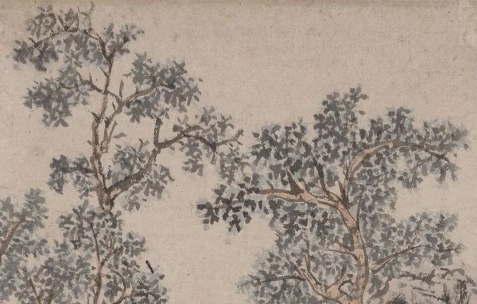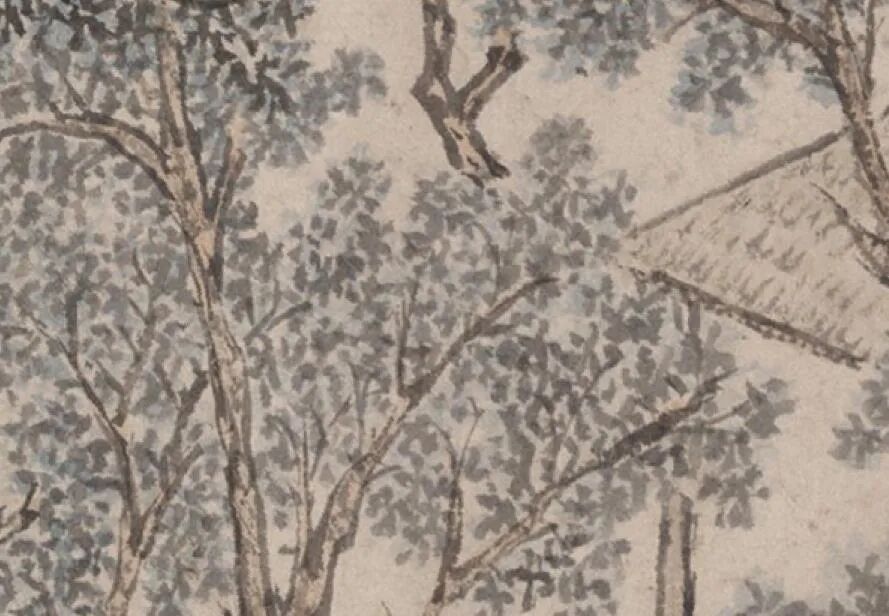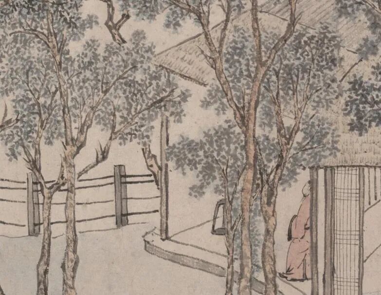 《藂桂斋图》极小而精巧,只用浅绛和墨青,清清淡淡地画了山石旁一间书房(仔细看山石旁是有书卷的),书房周围七棵桂树,人也少,只一个懵懂的小书僮,和一个踱出书斋,倚门观望的书斋主人。