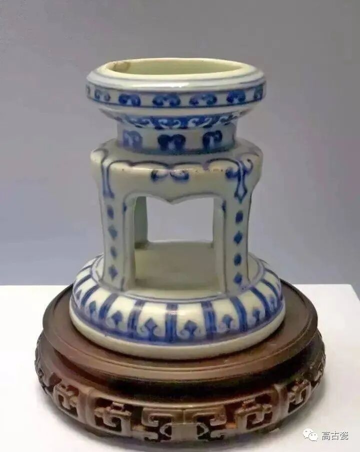 此为佛前供器净水碗的座。敛口、束颈、直腹、阔底、圈足。外壁青花装饰。口、颈部和腹部均绘不规则半圆和圈点纹,腹部镂空。足部绘变形莲瓣纹。外底署青花楷体“大明正德年制”六字双行外围双圈款。