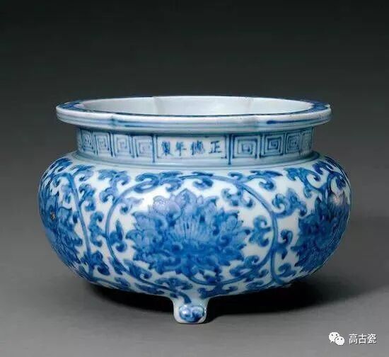 炉直口、方唇、折沿、短颈、圆肩、鼓腹、收底,底下承以三足。炉口呈六瓣葵花形。除了足底和炉外底有一圈涩胎外,其他部分均施白釉。通体青花装饰。颈部绘回纹。腹部满绘缠枝莲纹,三足绘如意云头纹。颈部中间一双长方框内自右向左署青花楷体“正德年制”四字横排款。