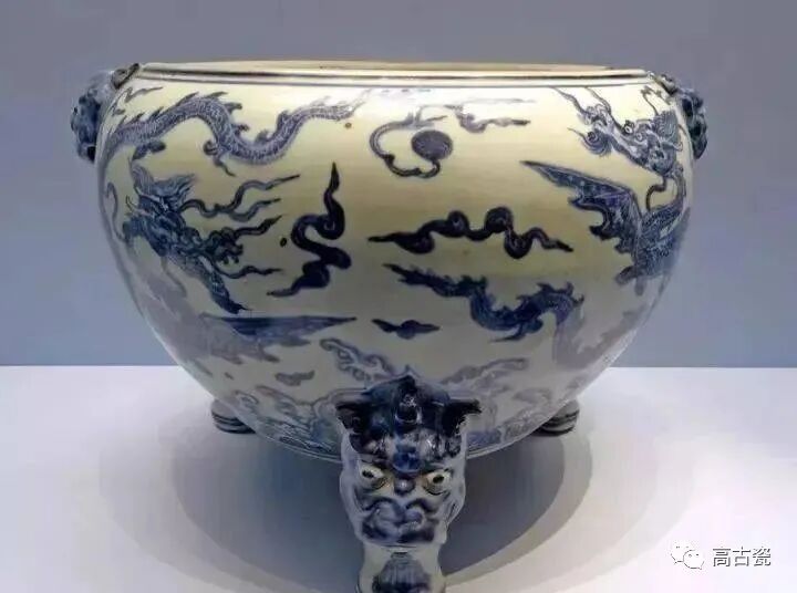 炉口部残缺,溜肩、鼓腹、腹下渐收、平底无釉,下承以三个兽头形足。中心开一圆孔。肩部两侧各置一铺首。腹部绘三条应龙,上下腾飞,笔触生动。间绘祥云朵。近底处绘海水江崖纹。
