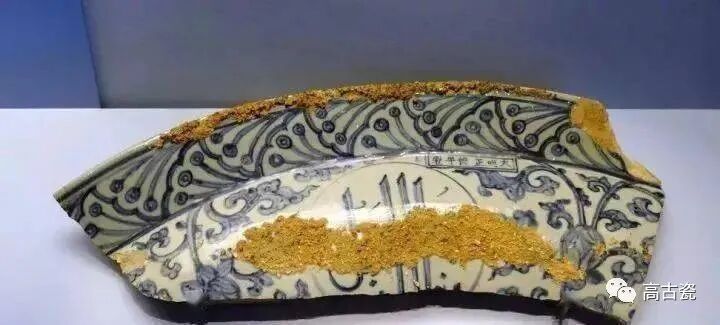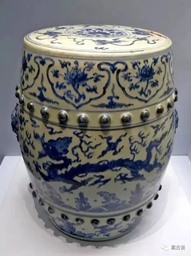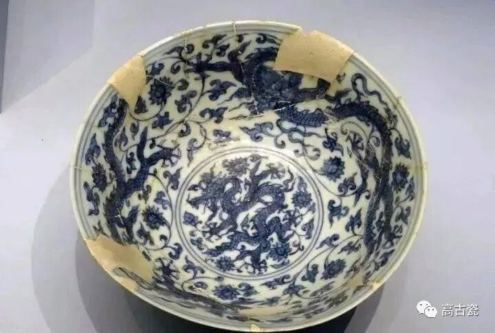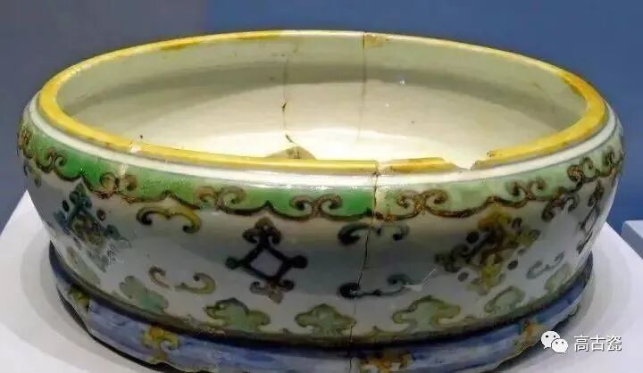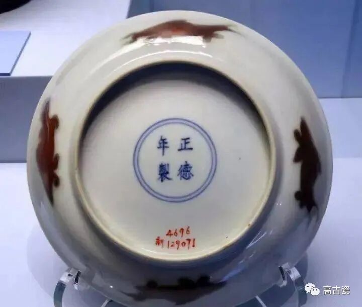 该部分展柜背景图所展示的传世故宫博物院藏的和1987年江西省景德镇市御窑遗址出土的景德镇御窑博物馆藏的正德青花龙穿莲枝纹渣斗的对比图