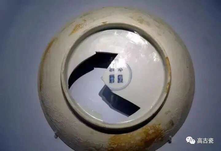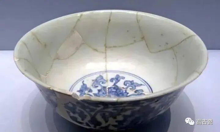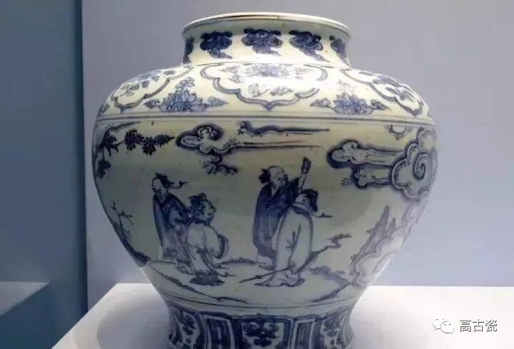 这种渣斗有时候叫尊,在正德时期烧制得特别多,除了青花之外还有矾红、黄地绿釉、白釉等,大小也都差不多。这种青花的特点是内外都画图,这时候装饰开始变得繁缛,成化、弘治时期很少内外都画图案。展出了一件故宫藏的,对比展出的则是景德镇窑址出土的,因为青花散掉了没烧好,所以把它砸了。