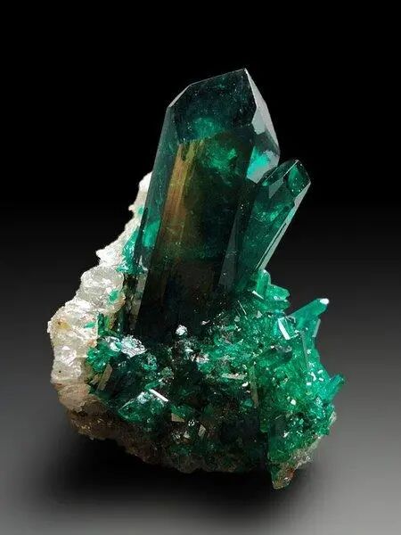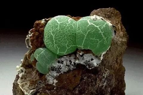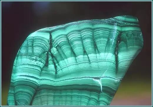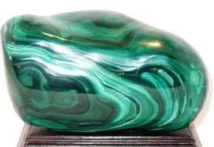 单斜晶系孔雀石是含铜的碳酸盐矿物,呈翠绿或草绿色的块石。孔雀石作观赏石、工艺观赏品,莫氏硬度2-4。