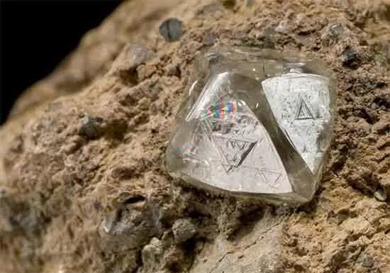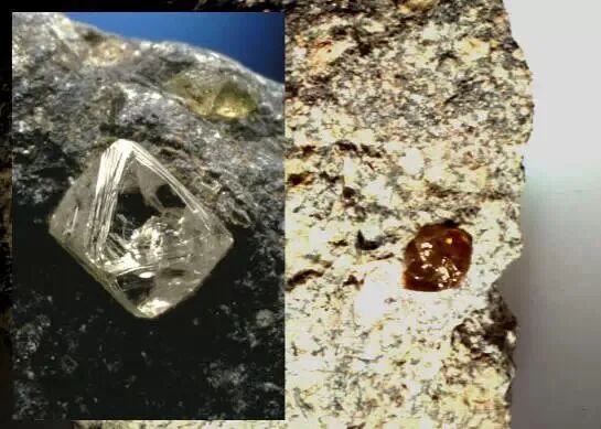 是一种由碳元素组成的矿物,无色微带蓝色者称为“水火钻”价值最高。粉、蓝、绿、金黄等色因罕见也为珍品。摩氏硬度10金伯利岩中的钻石晶体 .