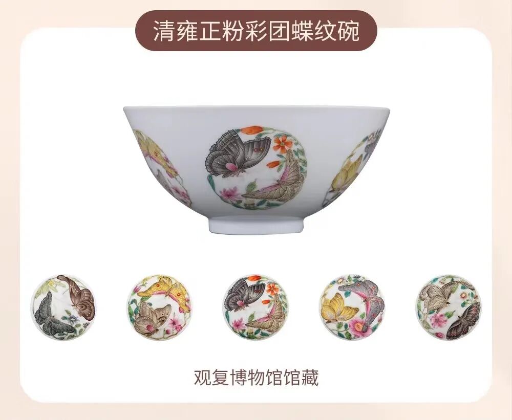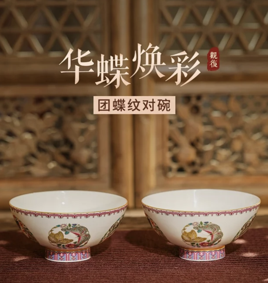 观复博物馆以馆藏【清雍正粉彩团蝶纹碗】为设计灵感,推出了一款【观复华蝶焕彩团蝶对碗】。