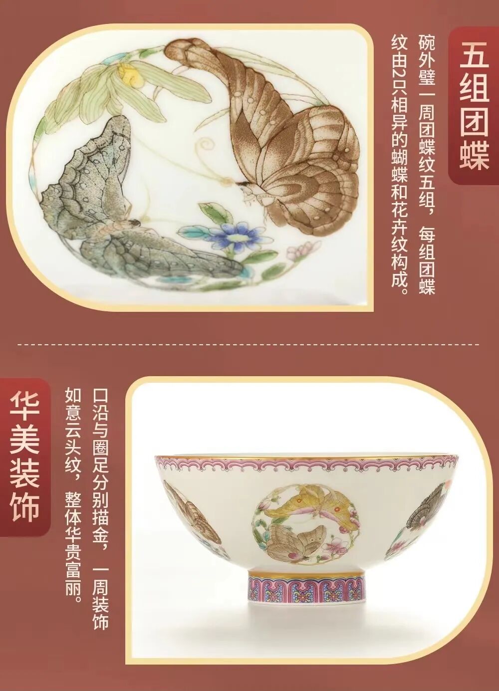 在装饰效果上更为丰赡,延用古往今来人们喜闻乐见的团蝶纹样,构图既古又新,在碗沿和圈足上分别添加了描金装饰。