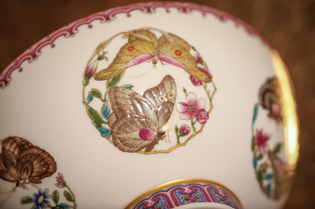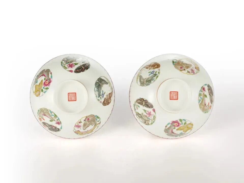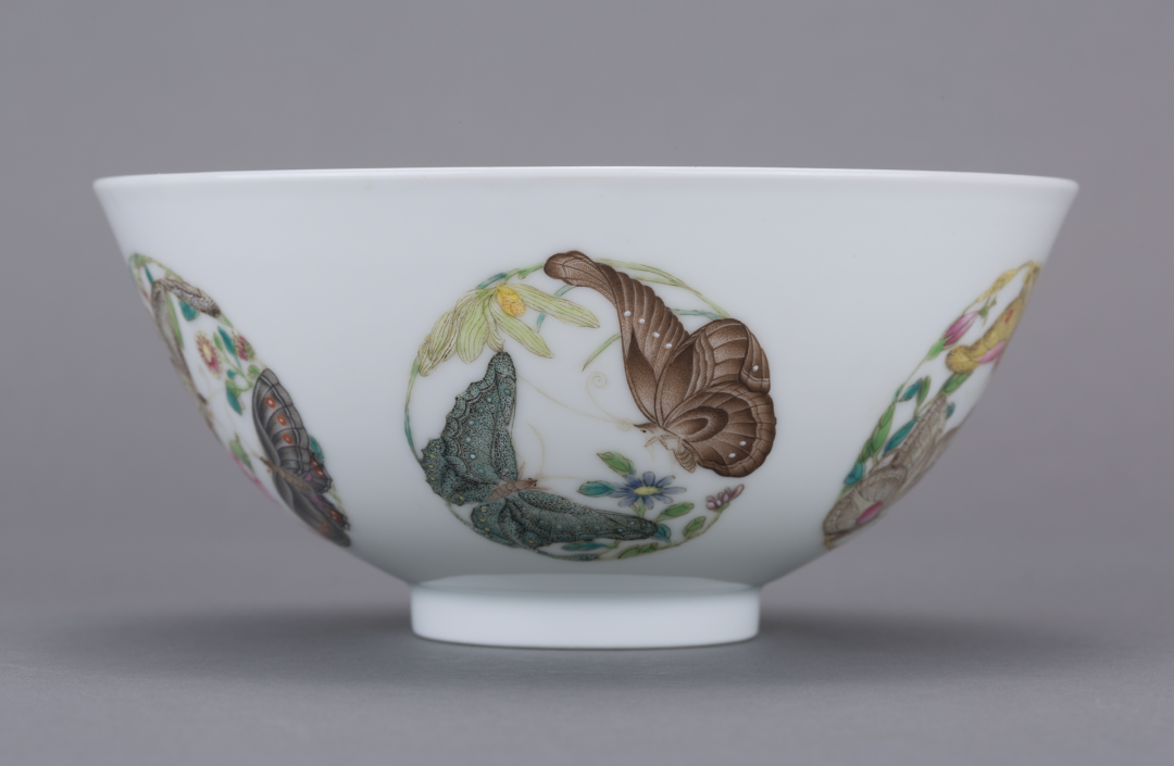 此华蝶焕彩团蝶对碗,外壁一周装饰有五组团蝶纹。每组团蝶纹皆由两只纷飞的蝴蝶及花卉构成,每组蝴蝶各不相同。