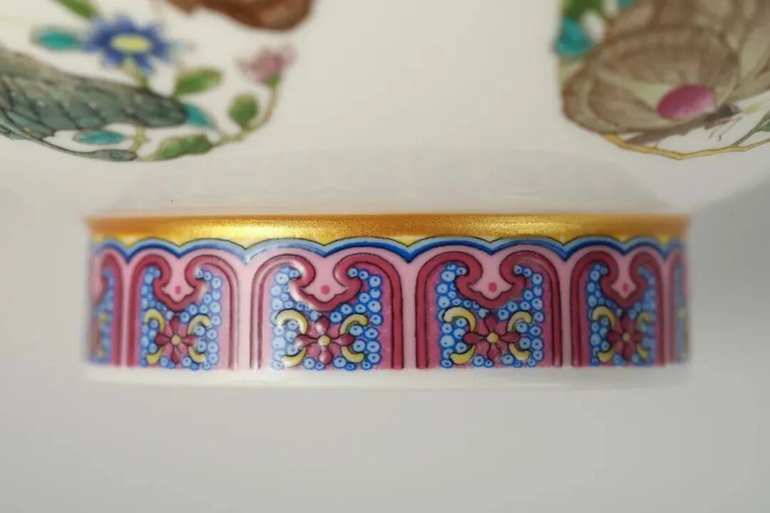 此器是代表雍正粉彩瓷器极高水平的作品,端庄秀美,一派淡雅柔和,五处团蝶纹设有明黄、淡黄、水绿、墨绿、粉红、铁红、浅蓝、天蓝、藕荷、秋香、淡墨等色,鲜艳优雅。