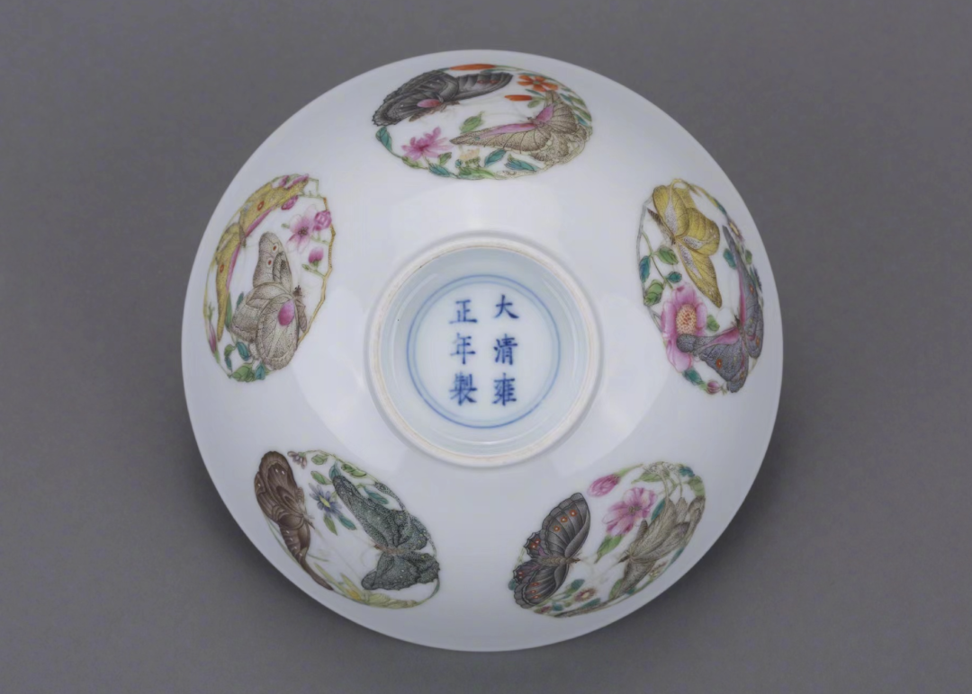 观复博物馆馆藏一件【清雍正粉彩团蝶纹碗】,此碗清丽脱俗,胎体坚致细腻,通施白釉,釉汁滋润匀净。足底滚圆如“泥鳅背”状,足底青花双圈内楷书“清雍正年制”六字款。