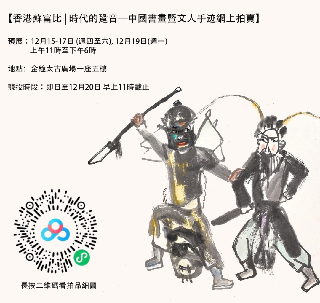「时代的跫音─中国书画暨文人手迹网上拍卖」现已开拍,并于12月15至17及19日于香港苏富比艺术空间举行展览。