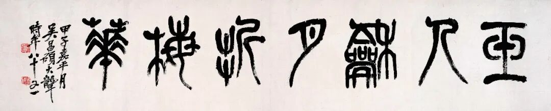 说明:此篆书横幅 , 笔力筋骨内涵,有如屈铁。在章法上,布白均匀,左右相兼,开合有度,气势壮阔。其用笔圆融沉酣,墨色浑厚华滋,气息高古深邃,于苍劲中姿媚跃出,于古雅中天趣溢发,是吴昌硕的晚年篆书精品。此帧作于 1924 年,吴昌硕已是 81 岁的老人。他把整饬的大篆写得极具个性特征,将一般的平齐错成各具姿态;将匀称的线条变为随意的回互圆转;将具有残破感的文字统一在恒常的节奏中,用毛笔写出金石之气,达到了炉火纯青的高度。可见,吴昌硕在篆书上所取得的成就是毋庸置疑的。