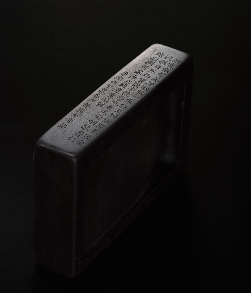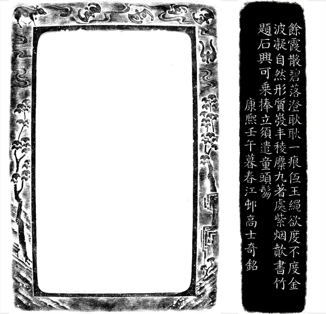 边铭文:余霞散,碧落澄。耿耿一痕低玉绳,欲度不度金波凝。自然形质发丰棱,麋丸着处紫烟歕。书竹题石兴可乘,捧立须遣童头鬅。康熙壬午(1702年)暮春,江村高士奇铭。