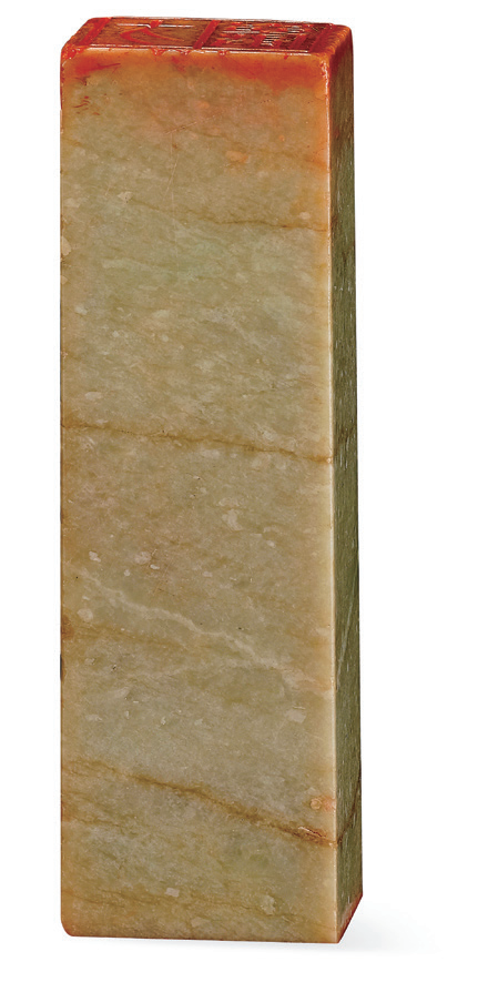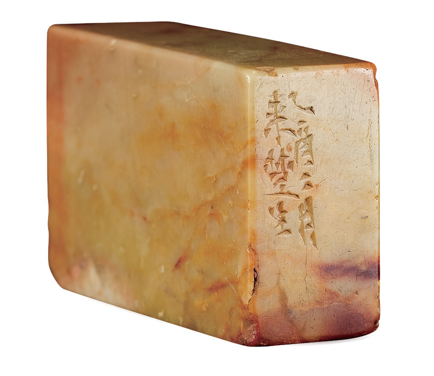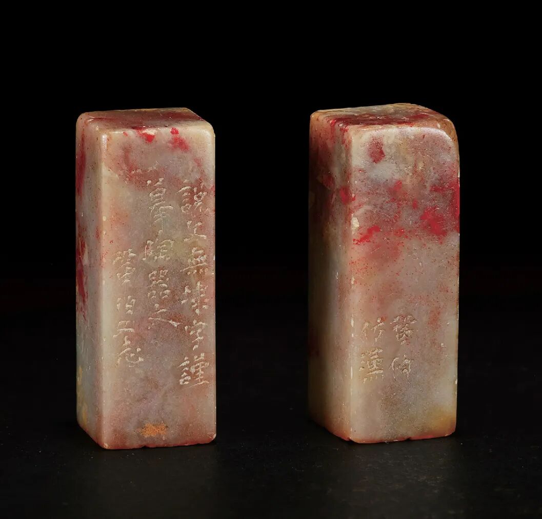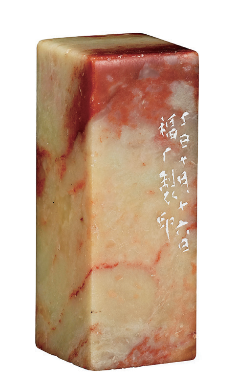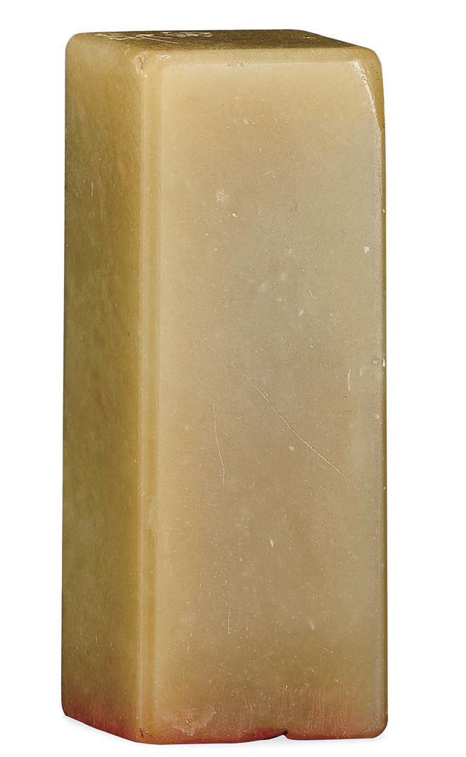 说明:这枚印章材质为水洞高山石,底色洁白,莹透绝伦。印钮为平台格局,采取写实手法雕刻双兔,兔身玲珑,一左一右,俯仰有致。兔子是仁慈、举止文雅、善