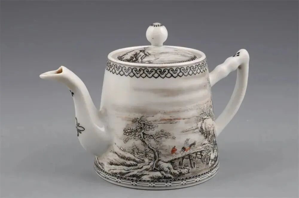 “文人画”通俗来说就是读书人画的画,主要是用墨,不用太多颜色,不像宫廷画那么艳丽,画面很淡雅。而“浅绛”一词原本是国画术语,指元代黄公望以水墨勾勒轮廓并略加皴擦,以藤黄、淡赭、花青等色彩渲染而成的山水画。其随意自然的审美意向与文人画的美学追求相吻合,成为明清画坛推崇的主流。受此影响,晚清一批有文人素养的民间艺人将浅绛技法移植到瓷器上,创烧出浅绛彩瓷。因其清逸淡雅的风格,浅绛彩瓷被誉为“文人瓷画”,制作者多为能书擅画的文人雅士。