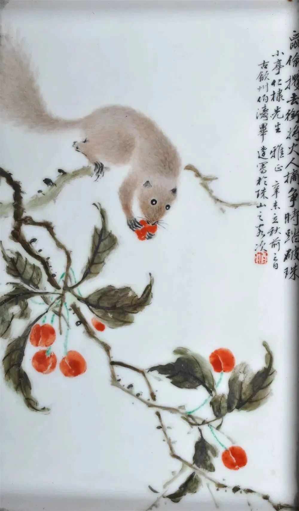 毕伯涛 粉彩松鼠樱桃图瓷板