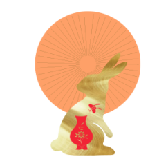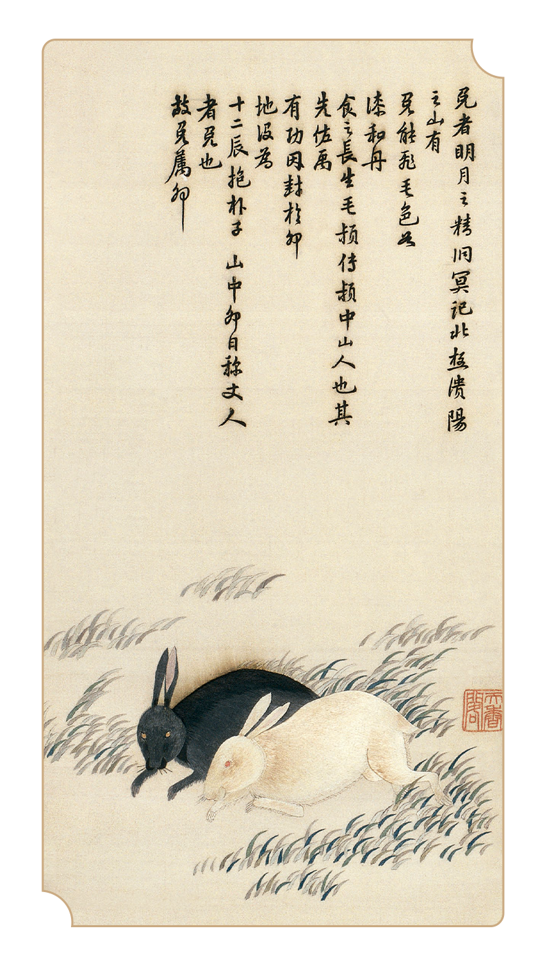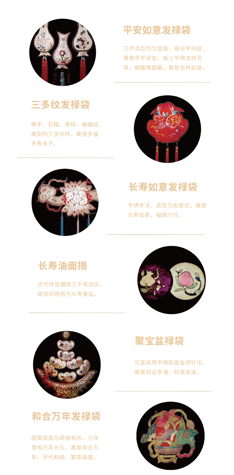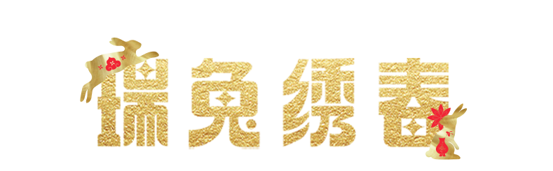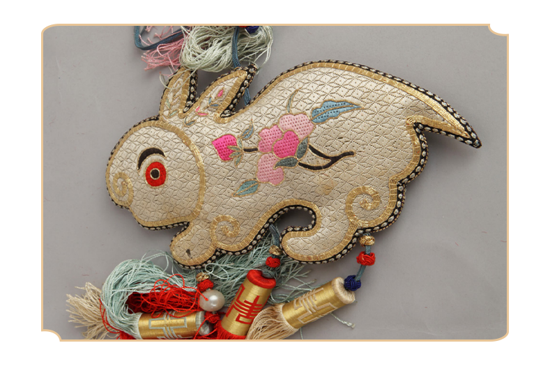 我们选取苏州博物馆藏苏绣文物中的吉祥纹样:宝瓶、蟠桃、元宝、佛手、石榴、蝙蝠纹等,与瑞兔形象结合,赋以热烈色彩,组成一幅春意融融、生机盎然的画卷。