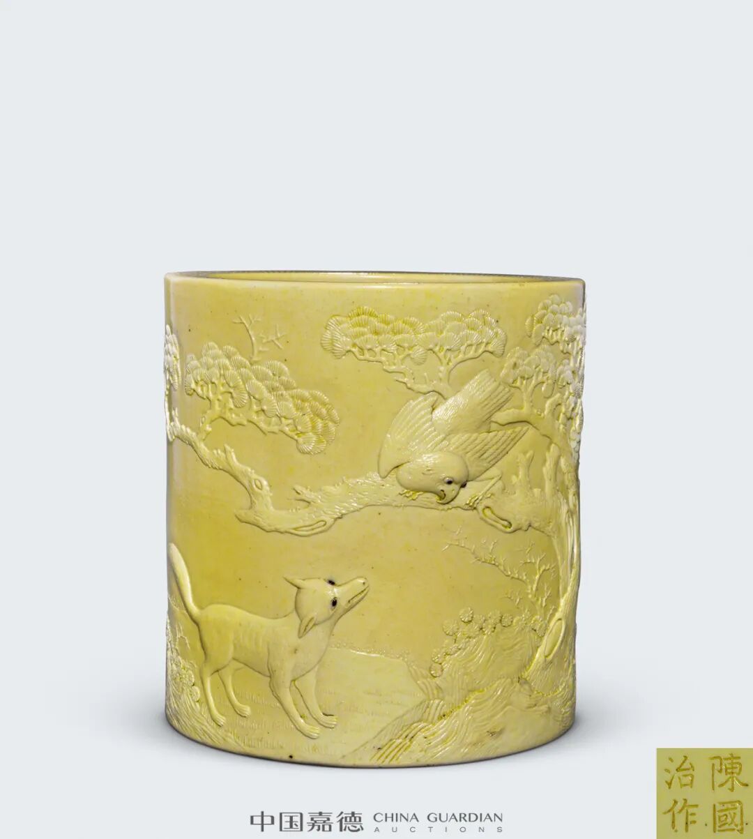 陈国治作黄釉雕瓷瑞兽纹笔筒