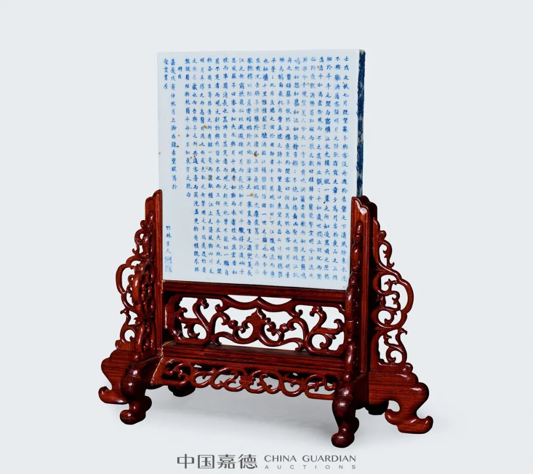 青花楷书尽录苏轼《赤壁赋》全文,通篇布局严谨,字体清秀,行距疏密得当。如此通篇全文誊录,可谓气势磅礴。以《赤壁赋》全文搭配游赤壁图乃典型康熙朝青花器物装饰之一,嘉庆朝以此为饰,甚是少见。Lot 3422