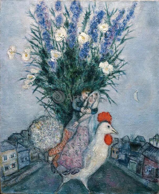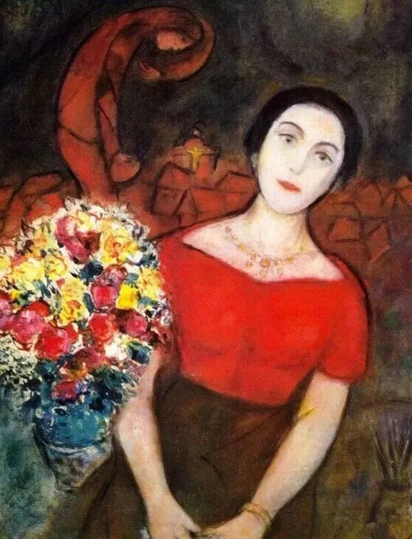 他的作品色彩鲜艳,亦真亦幻,常依靠内在诗意的力量而非绘画逻辑规则,把来自个人经验的意象与形式上的象征结合到一起。因此我们常能看到人物、动物或花朵在空中漂浮着,或躺在紫丁香花丛中的女人同时拥有向左和向右的两幅面孔。而这个在画中常常被他描绘的女人,正是其钟爱一生的妻子贝拉。夏加尔的画里出现了非常多美丽的花束。花束对夏加尔也有着特殊的意义,因为他收到的第一束花,就来自贝拉。1914年7月7日,夏加尔忘记了自己的生日,贝拉却在那天大清早去市郊采花,还特意换上了美丽的长裙,再带上食物,飞奔到夏加尔的住处。闻着鲜花的芳香,夏加尔情难自抑,在生日后的几天便向贝拉求婚了。以后每逢结婚纪念日,当贝拉用花朵或各种五彩缤纷的东西装饰两人的房间时,夏加尔都会叫她保持固定姿势,为她画像。马克·夏加尔是现代绘画史上伟人,游离于印象派、立体派、抽象表现主义等一切流派。他的画中呈现出梦幻、象征性的手法与色彩,“超现实派”一词就是为了形容他的作品而创造出来的。画面中描绘的绿色的牛、天上飞的马在天上飞,倒立或飞走的头颅、中世纪的雕塑等奇幻现象,仿佛是画家亲眼所见。