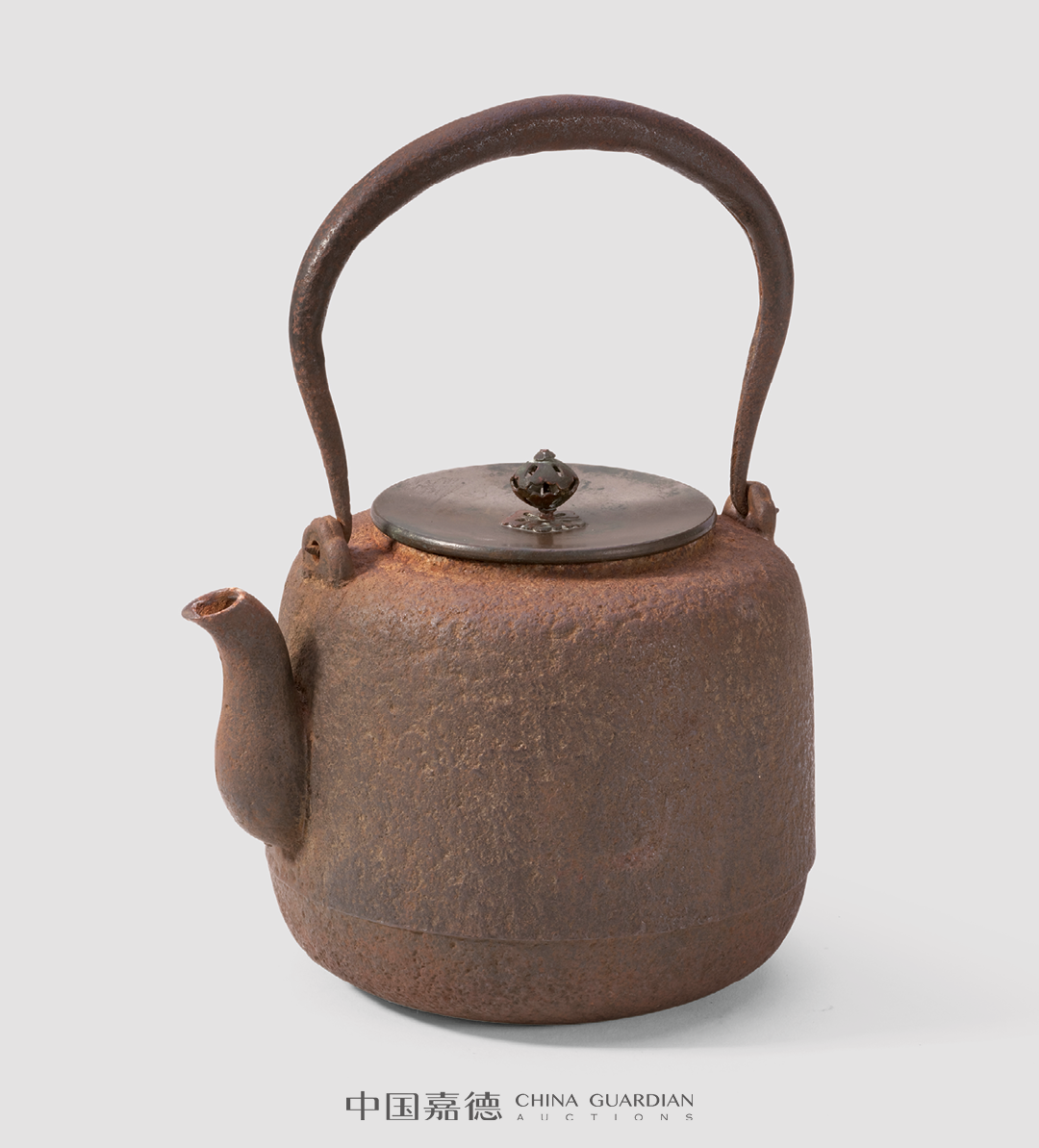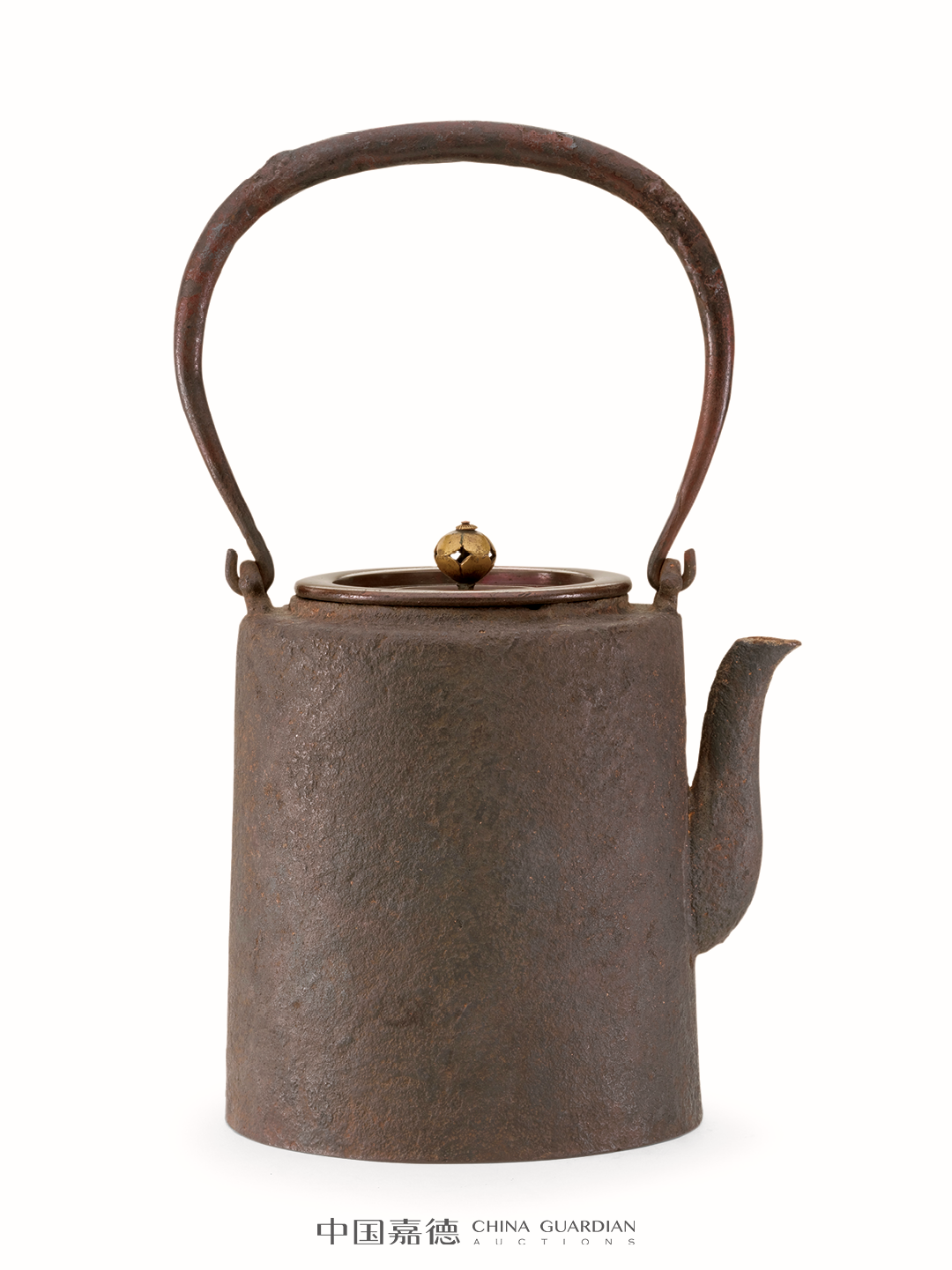 铁壶筒形,上祥云纹生动而古朴。斑紫铜盖,纹理瑰美