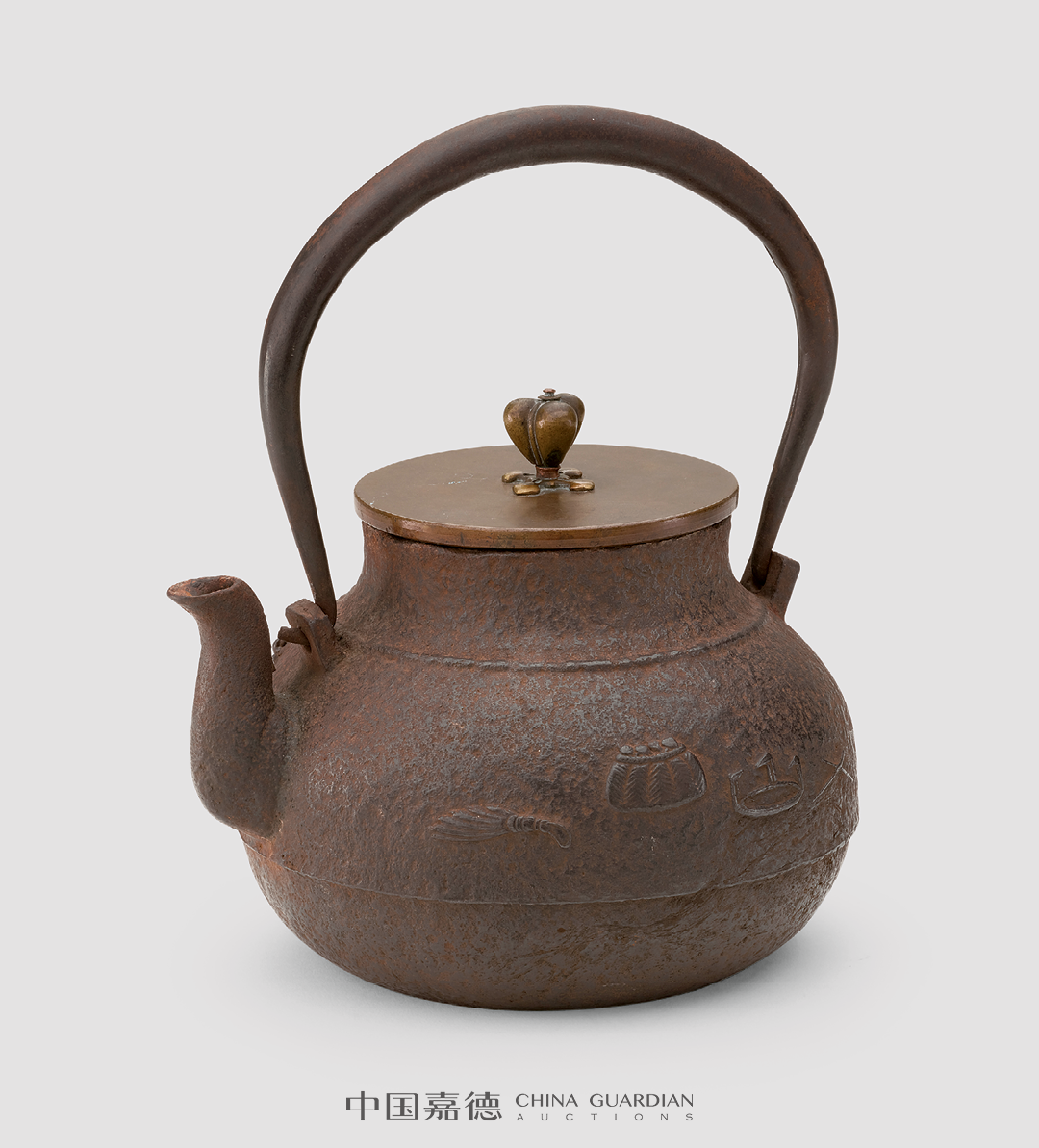 产生于日本江户时期,所制器品工艺精湛,装饰细腻,代表当时铸造工艺之最高水平。此件铁壶图案华美,刻工细致,当为日本铁壶经典之作,故而当为藏家珍视。