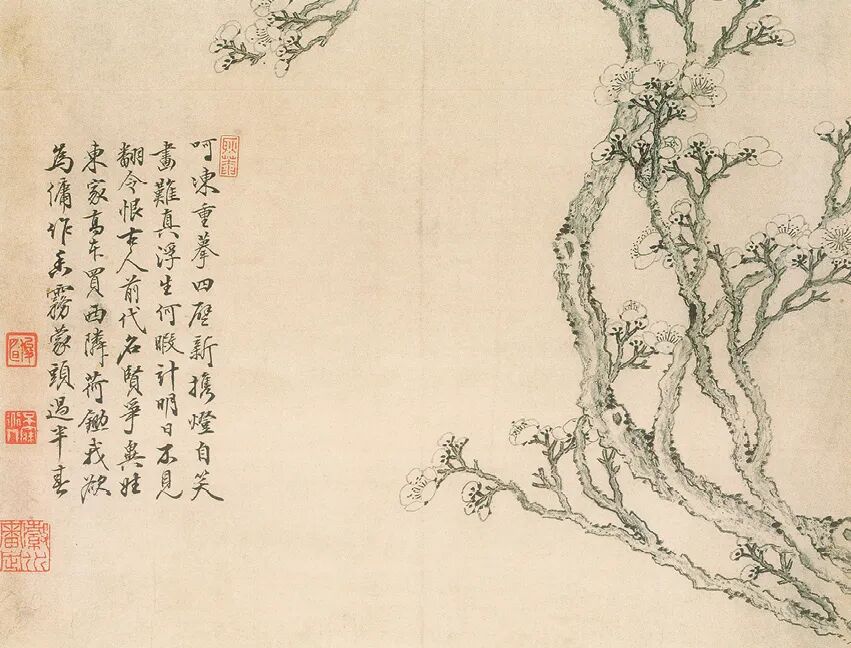 扇骨两面均由江寒汀作画,其于一面绘梅花,枝干虬曲,自扇骨中部而生,三朵寒梅绽放,一梢尖伸展至左下而止,自中部稍上偏右侧新生一枝,转入右上伸出画面,布局颇为灵动。据刻铭“仿金俊明”句,可知此面梅花笔意当由明末清初画家金俊明(1602-1675)而来。天津博物馆藏“金俊明梅花册页”,所绘梅花与此面颇类。