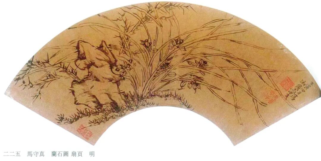 另一面前景生出兰草一丛,兰草顶部远景处又斜出翠竹两枝,长短相宜,蔚为写实,颇为生动。通过江寒汀题铭“仿马四娘”句,可知此兰竹笔意按明代闺秀画家马湘兰(1548-1604)而来。故宫博物院藏“马守贞兰石图扇面”,其兰石笔意,亦与扇骨所写相类。