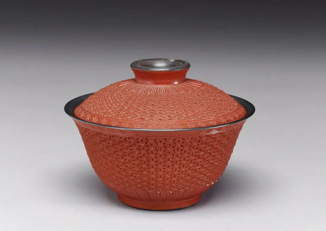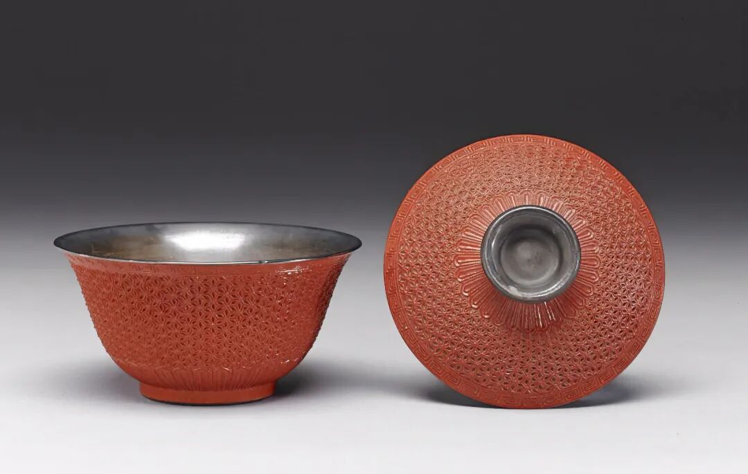 清 乾隆 仿雕漆紅釉銀裡蓋碗