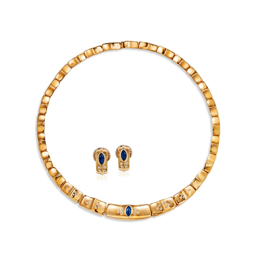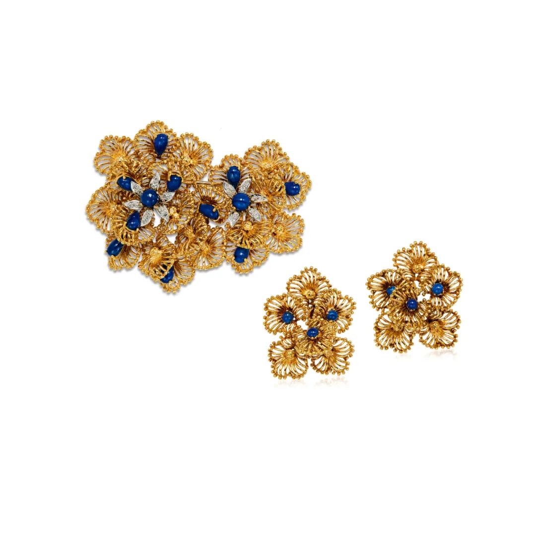18K金镶嵌青金石及钻石,耳环尺寸约为3.1×2.9cm,胸针尺寸约为6.2×4.7cm,约1950年代,意大利制