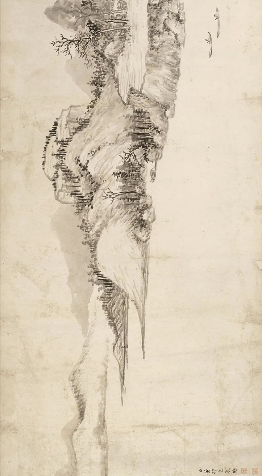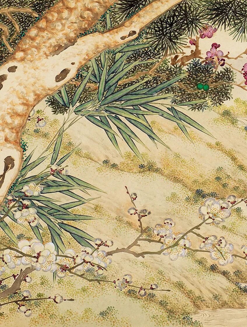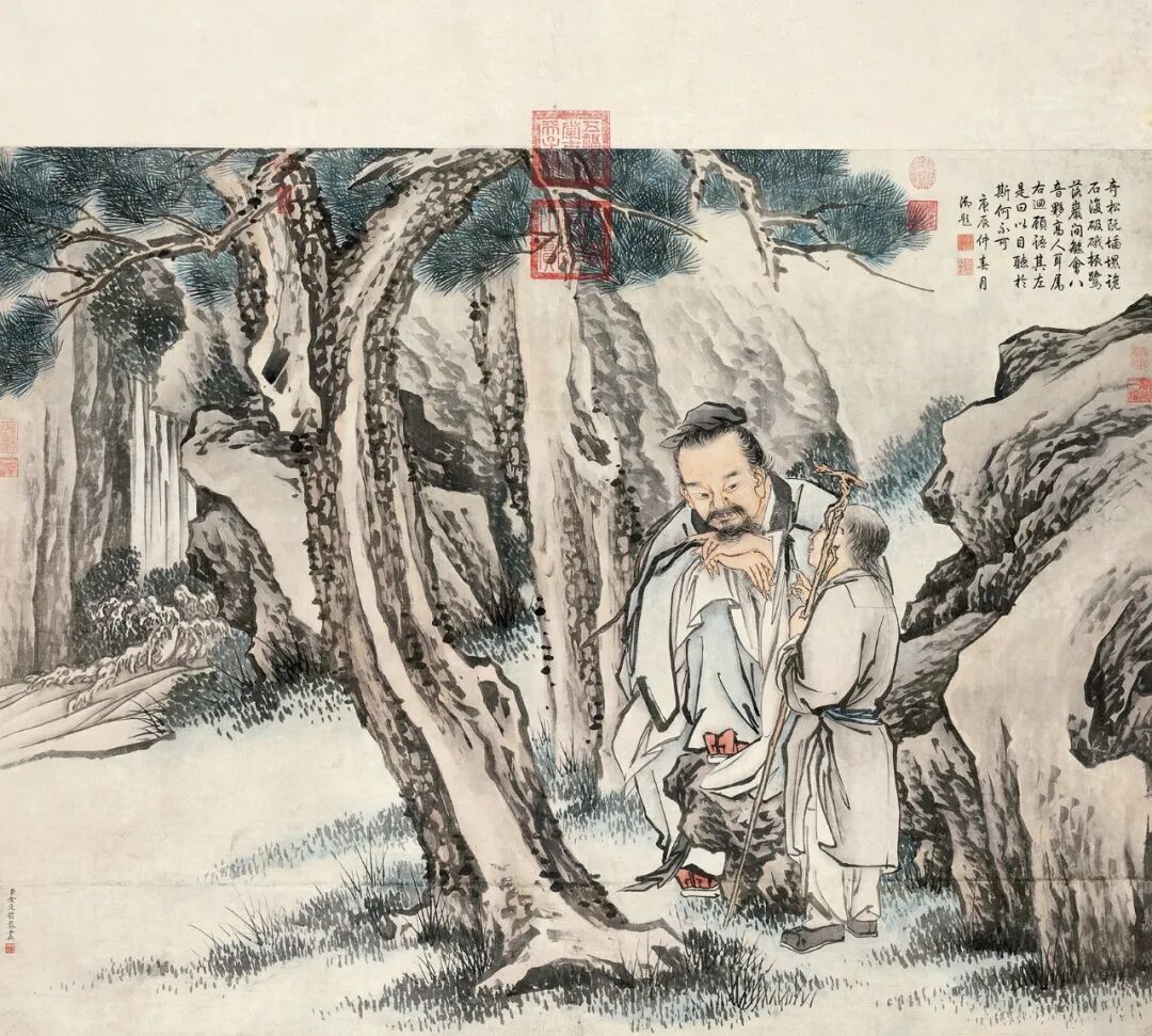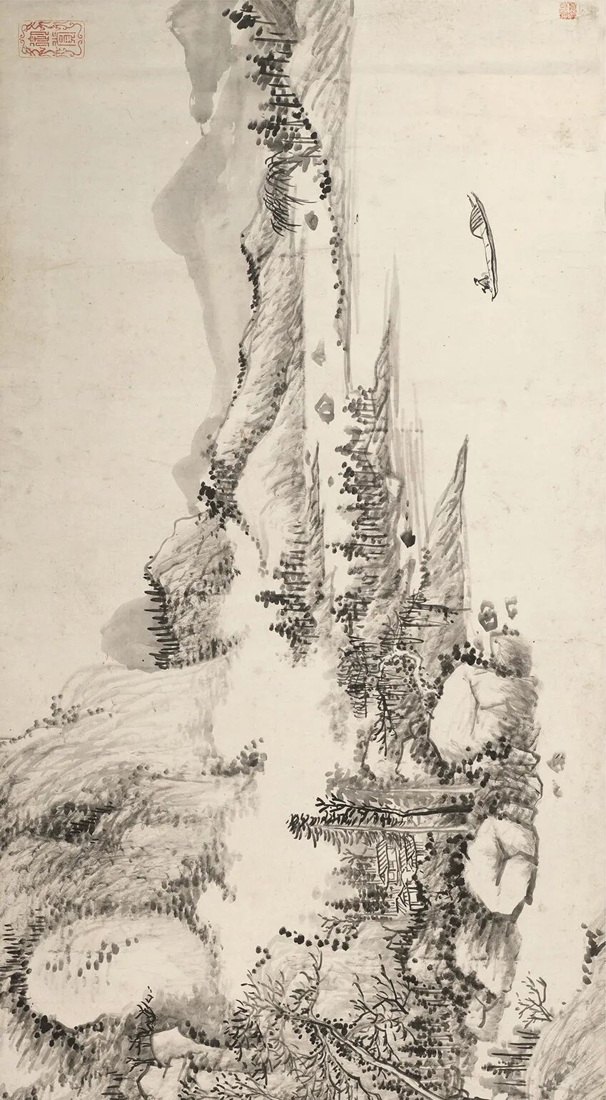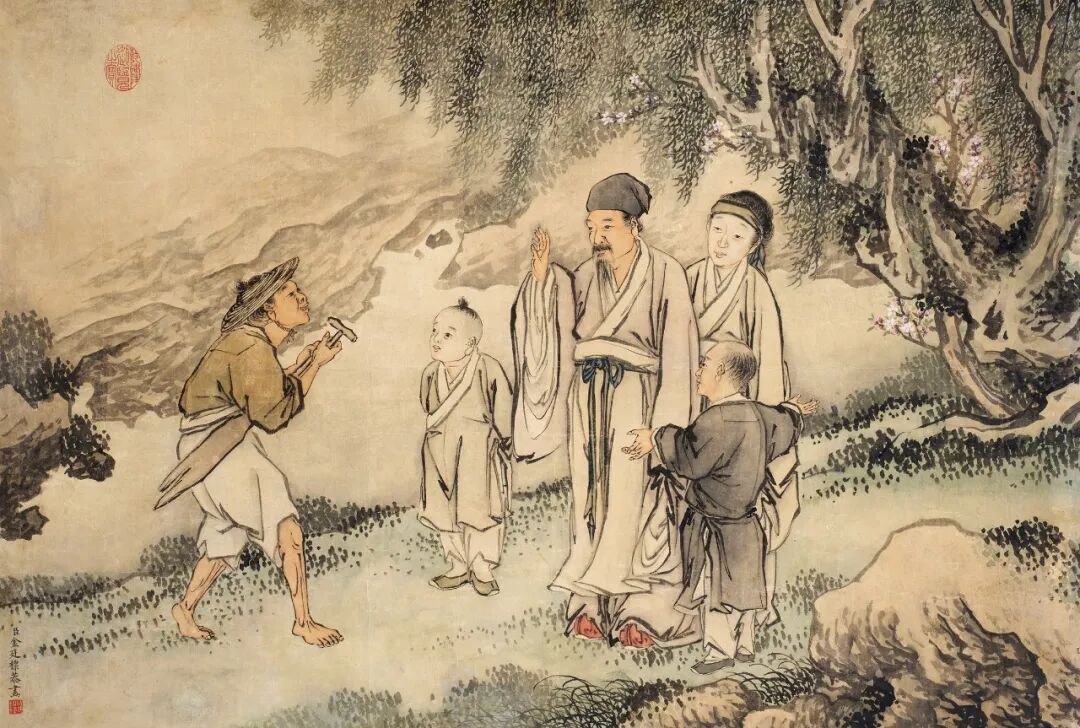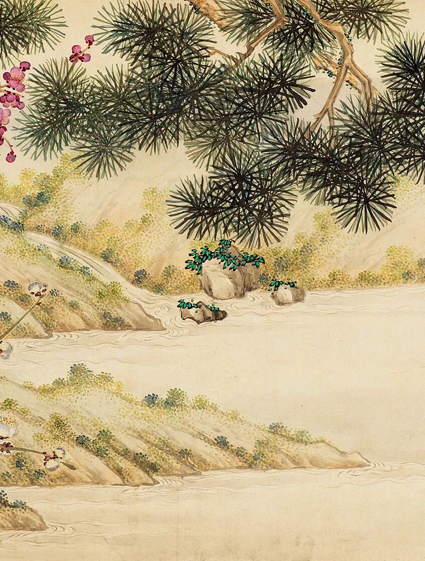 我们可以看出在用笔习惯上,本幅作品与《听泉图》《放鹤图》都如出一辙,包括人物衣褶及山石皴法,尤其是金廷标在处理大尺幅作品时,用重墨散锋,率意用笔却又极精确老道的笔致。各个人物的神态各异,桃源老者的和蔼亲切,躲在老者身后女眷的些许犹豫以及再到武陵人急切探路的归心似箭,还有画面右侧的若隐若现的桃花,都无不时刻在提醒我们画中的主题。