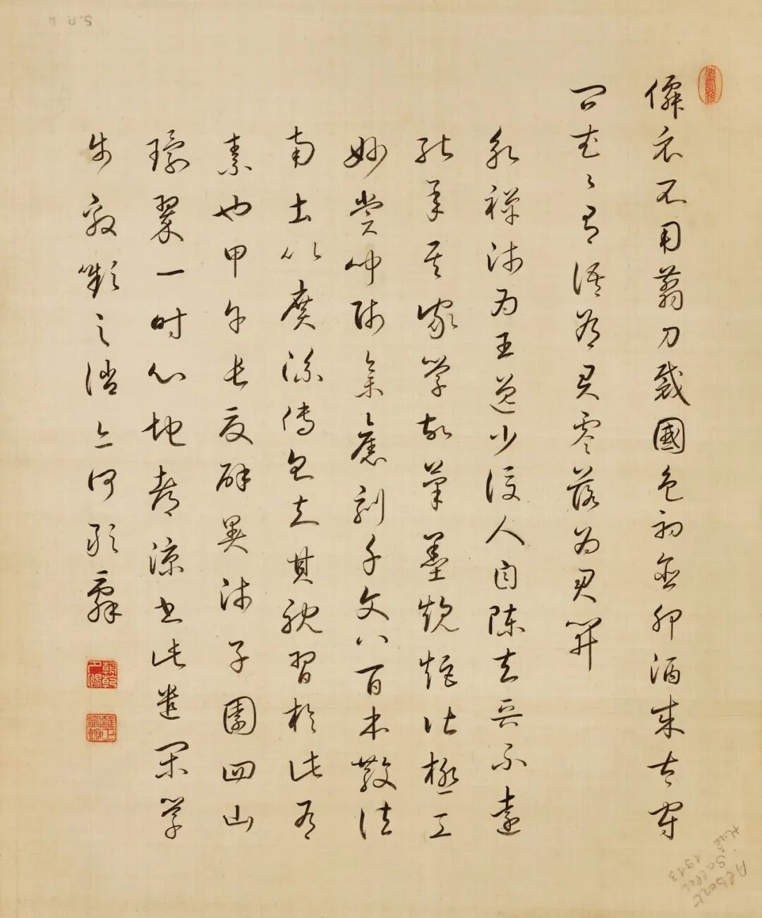清内府《朗吟阁法帖》收录的都是雍正帝继位之前的书法作品,光从这套刻帖的内容来看,雍正帝在书法和临摹上所下的功夫,不可不谓之深,从苏轼、米芾再到董其昌等,《养吉斋余录》:“圣祖最喜世宗宸翰,每命书扇,岁进百余柄”,雍正的书法也获得了他应有的成就—获得了圣祖皇帝的喜爱。本作1913年为AlbertSallet藏入,Albert Sallet是法国人,曾任军医、法国远东学派通讯委员。1925年退伍后,曾于上世纪中叶两度担任越南和法国地区的博物馆馆长,对于远东的情况熟稔,也为本作添加了分量。