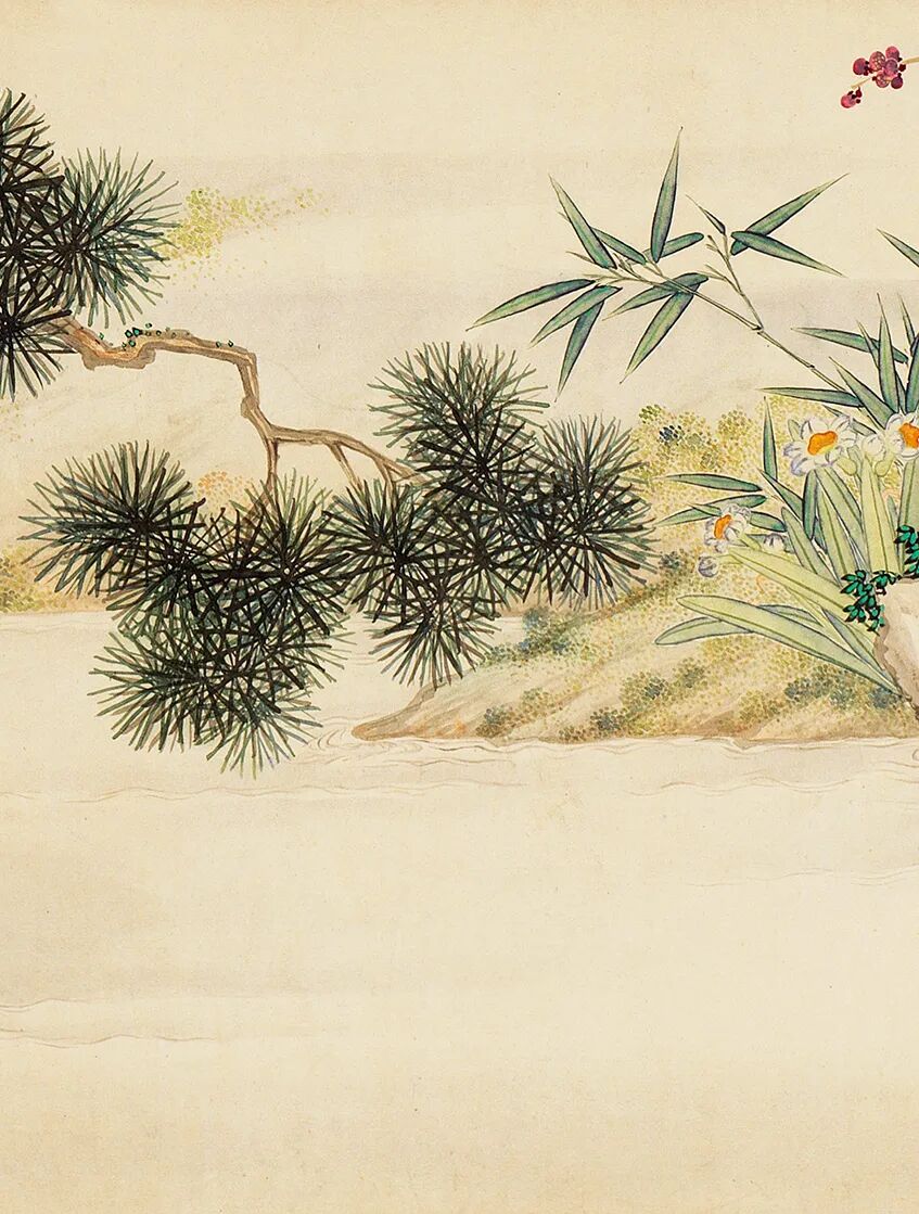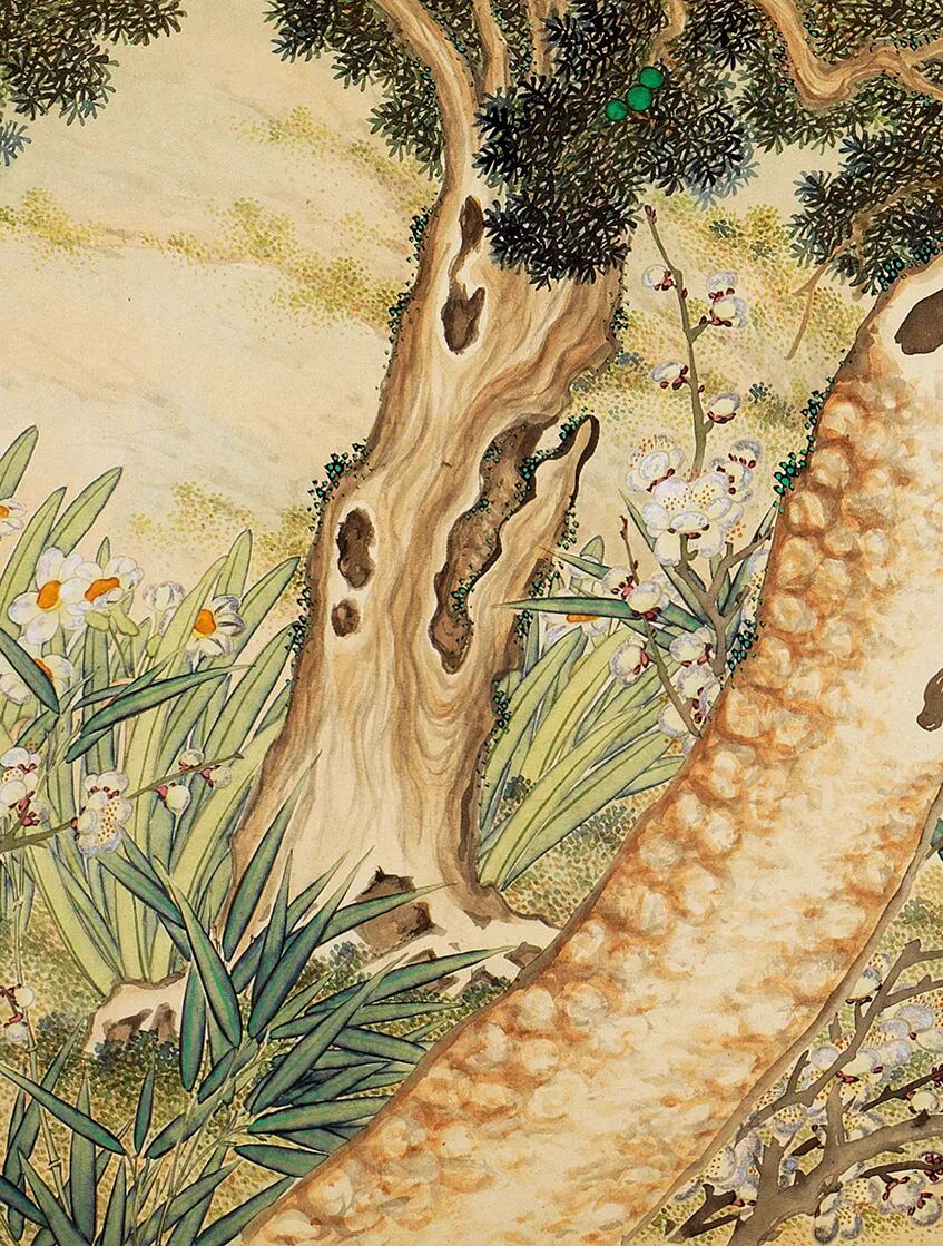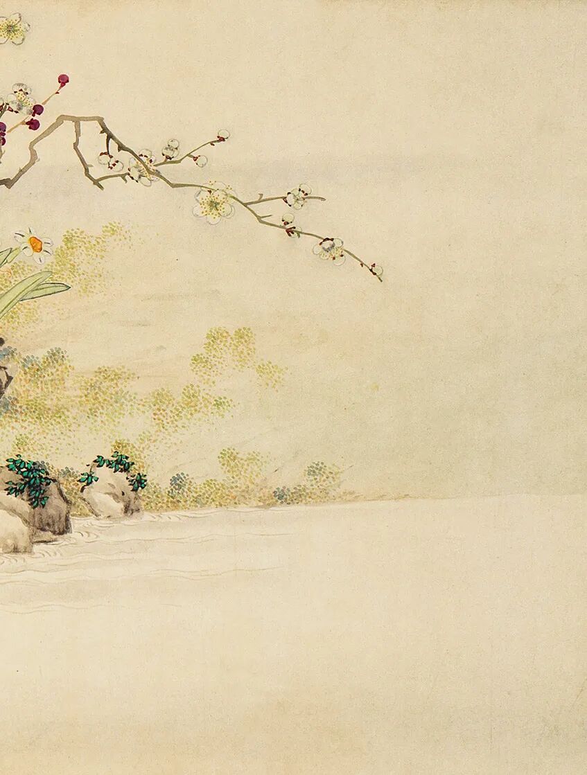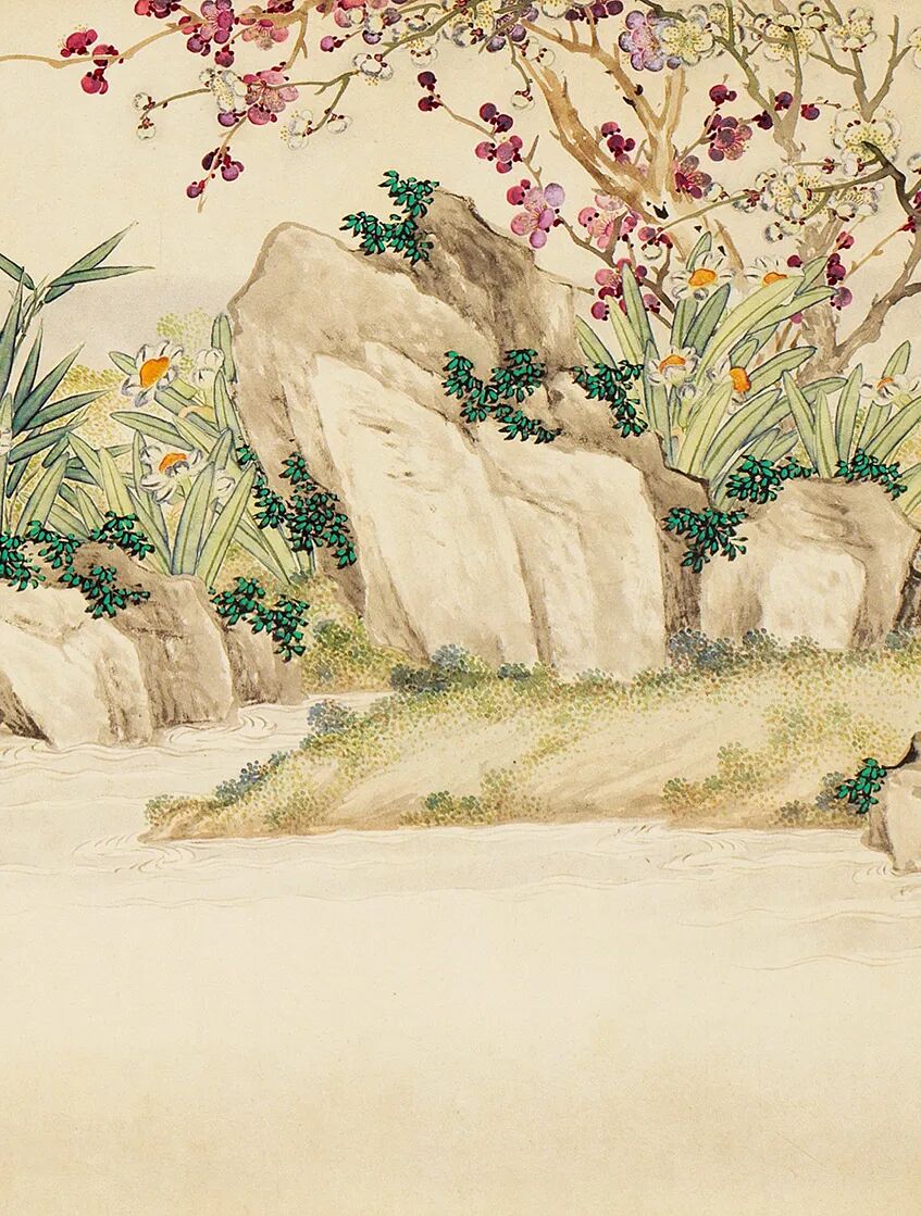 此手卷,设色纸本,所绘有山石树木还有花卉等。画作用细笔勾勒出山水轮廓,再一一晕染。用色清新淡雅,突出了山水的清新之气。在山石皴染中有着唐寅和沈周的用笔特征,凸显松树修长的特点和松针的洒脱,彰显出画家深厚的笔墨功夫和美学思想,给人一种很强的视觉冲击感。