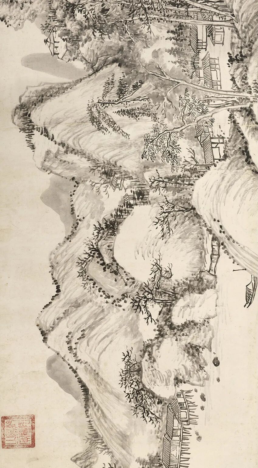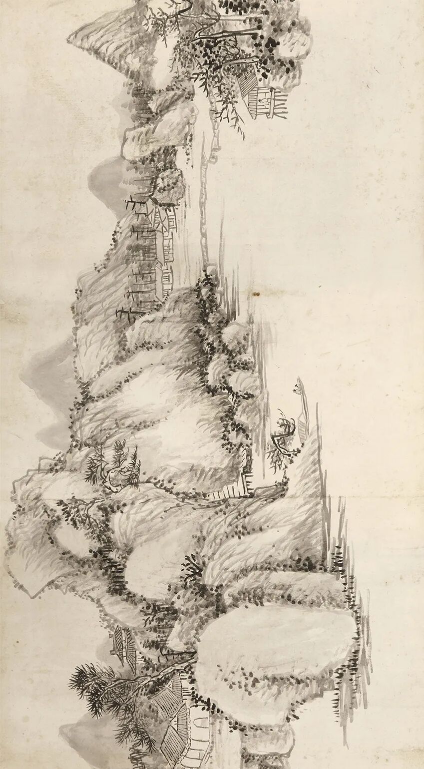 本作宽幅竖式,和春拍《听泉图》制式构图相当,都应当是为了宫中所绘制的,而因《桃花源记》的叙事情节,所以本幅可能是一组多幅之一,但完全不妨碍认定它是清代宫廷人物画艺术的杰出的价值。