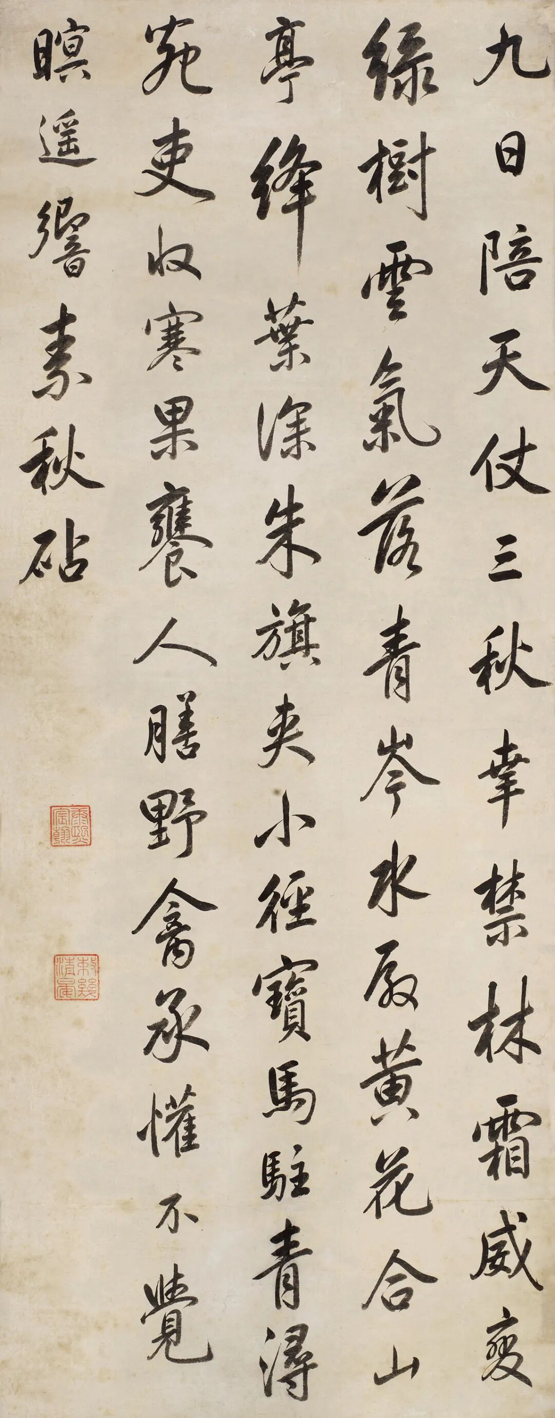 释文:九日陪天仗,三秋幸禁林。霜威变绿树,云气落青岑。水殿黄花合,山亭绛叶深。朱旗夹小径,宝马驻青浔。宛吏收寒果,饔人膳野禽。承欢不觉暝,遥响素秋砧。