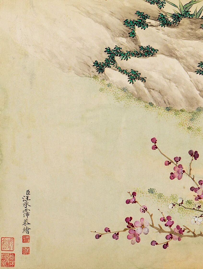 在图卷落款中可以看出汪承霈的书法的“赵董”风韵,书法结构特征依然取自赵孟頫的端庄,那种底盘略大的稳健从容。汪承霈作为清朝著名的翰林画家,不同于一般的画工。作品不但借鉴了院画作品工整细腻的特点,更具有文人画特有的笔墨情趣,历来为文人追捧。