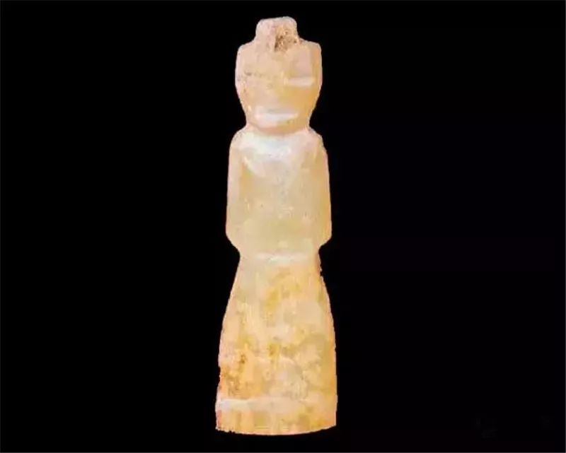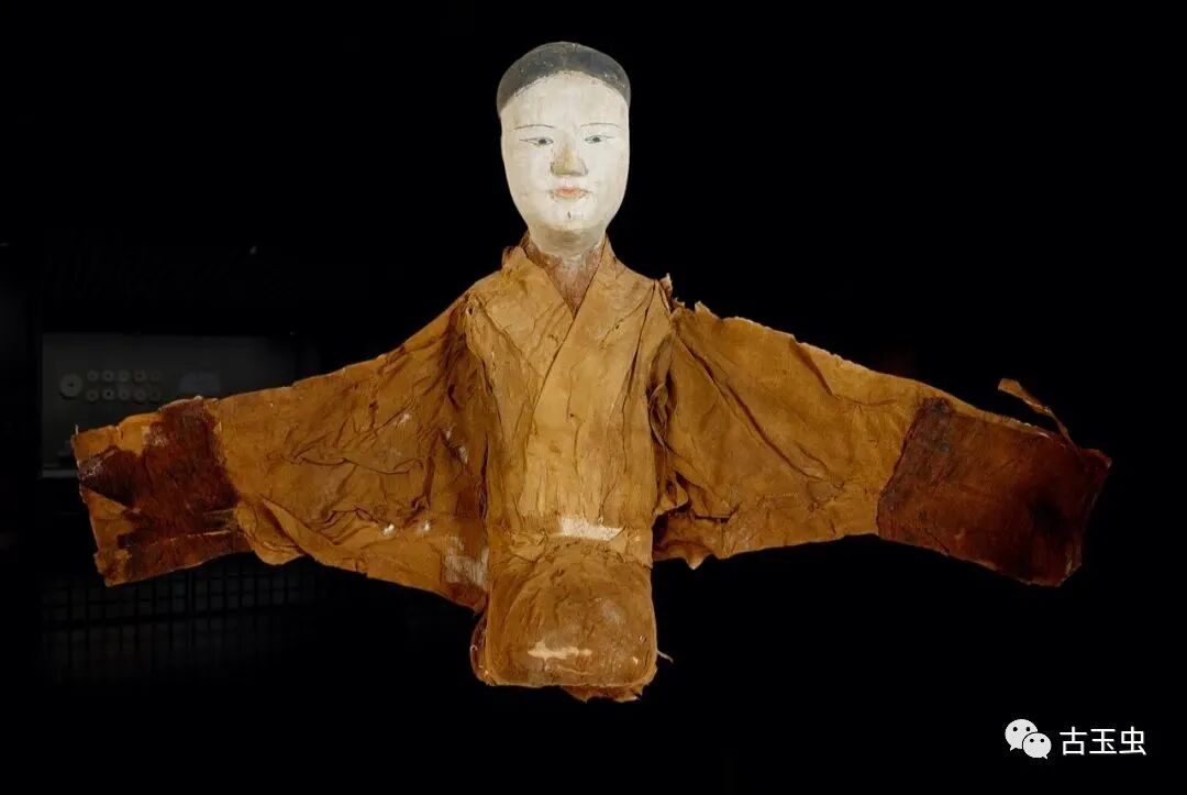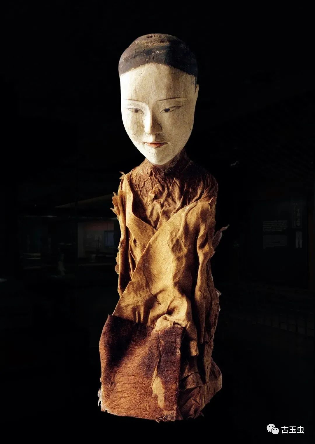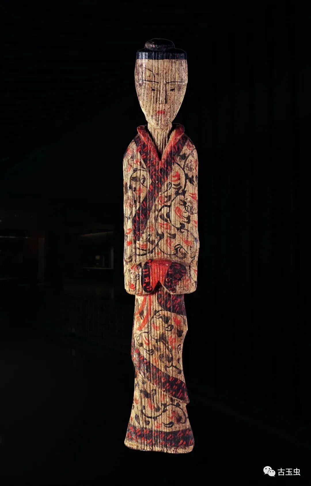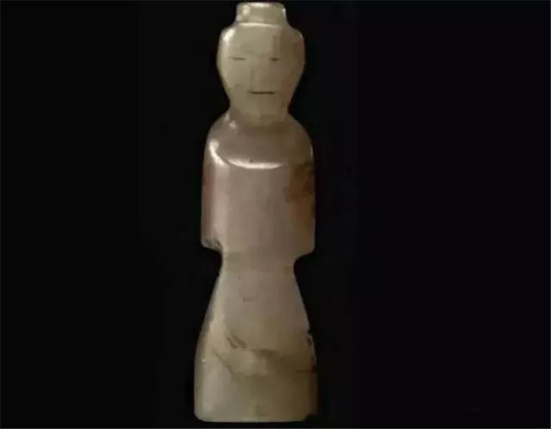 头下部直至胸部用压砣斜磨成一斜坡,近头处深,近胸处浅,非常平整。腰间以两道粗横弦纹,表示拱手,腰细,长衣拖地,下口拢集呈鸡笼式裙。