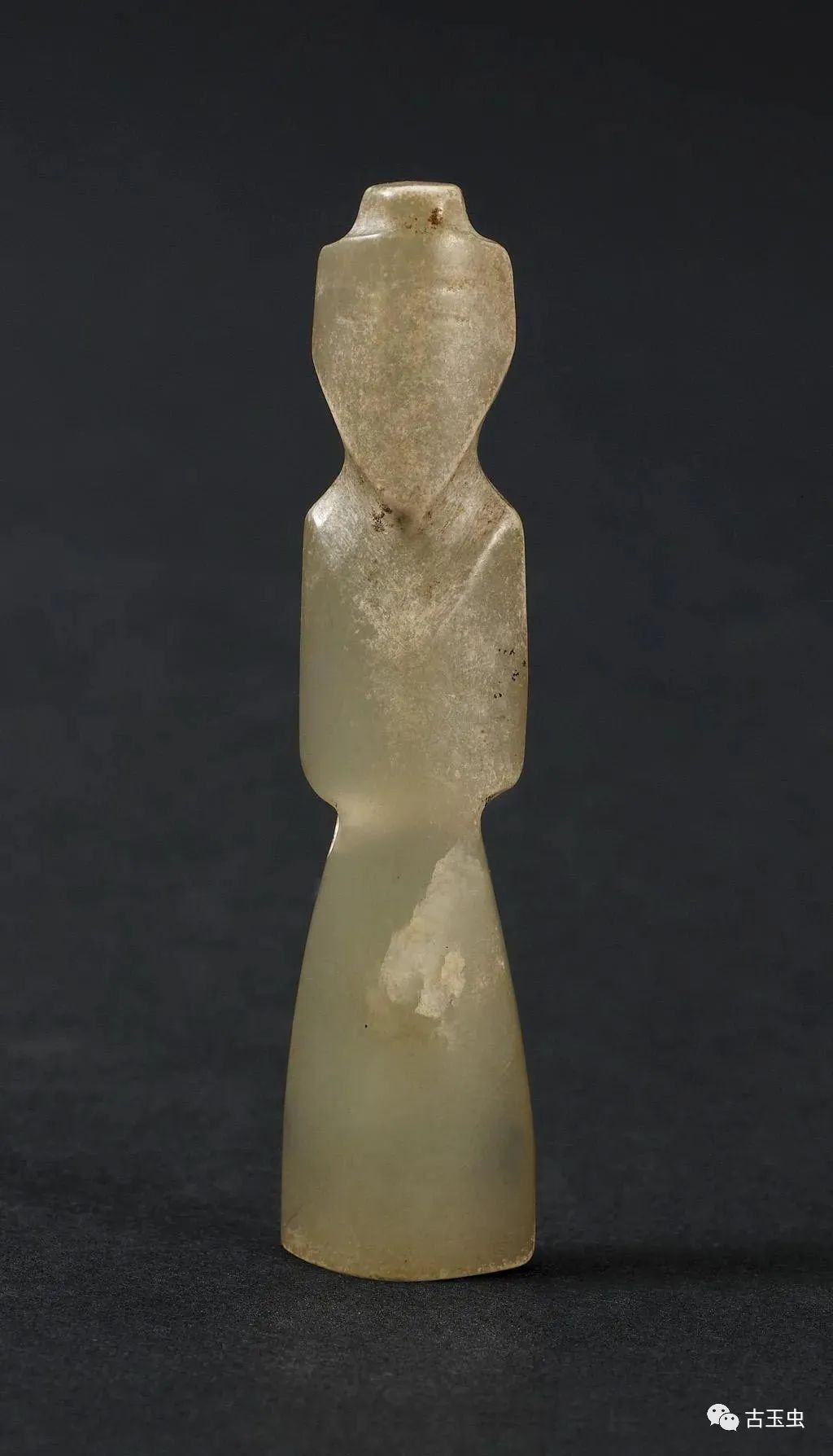 玉翁仲一般雕成文人形象,尺寸不大。整体呈扁担形为半圆雕,着长袍伫立状,头顶有长发髻,前低后高。脸长,表示出两眼一嘴,没有鼻子。五官刻画简单,只用一道短粗阴线表示,感觉像“汉八刀”的雕刻技法,刀法简练,粗犷有力。