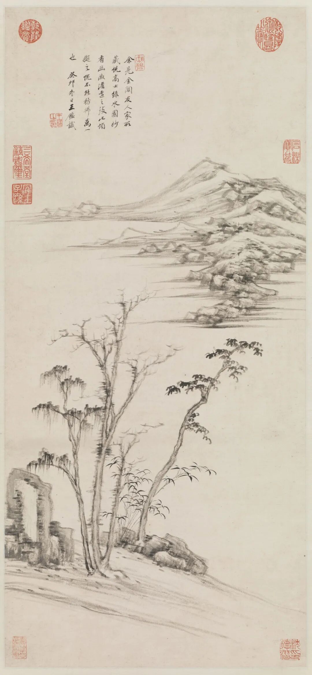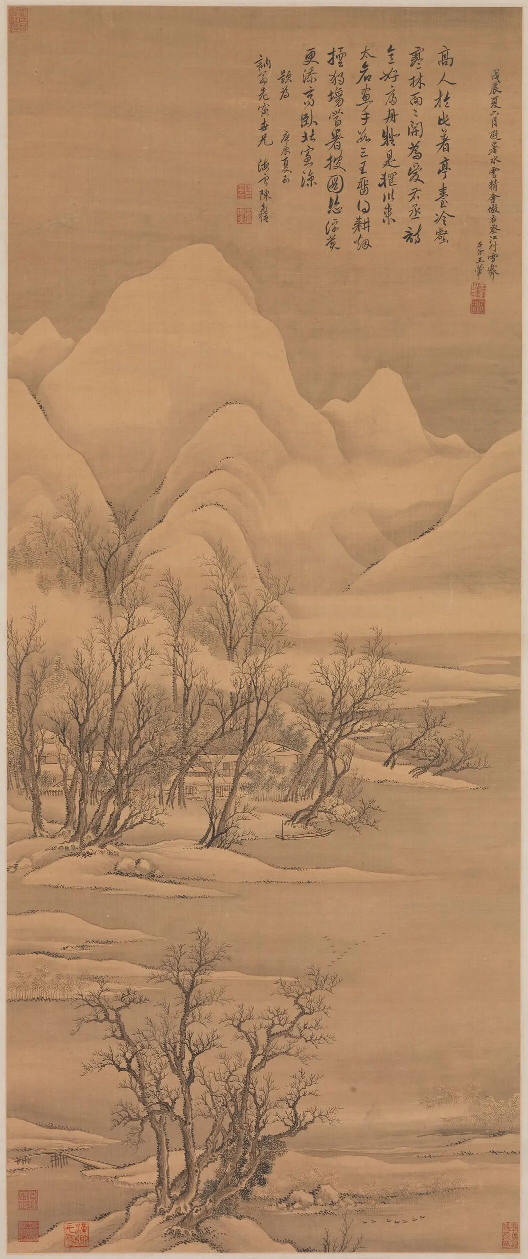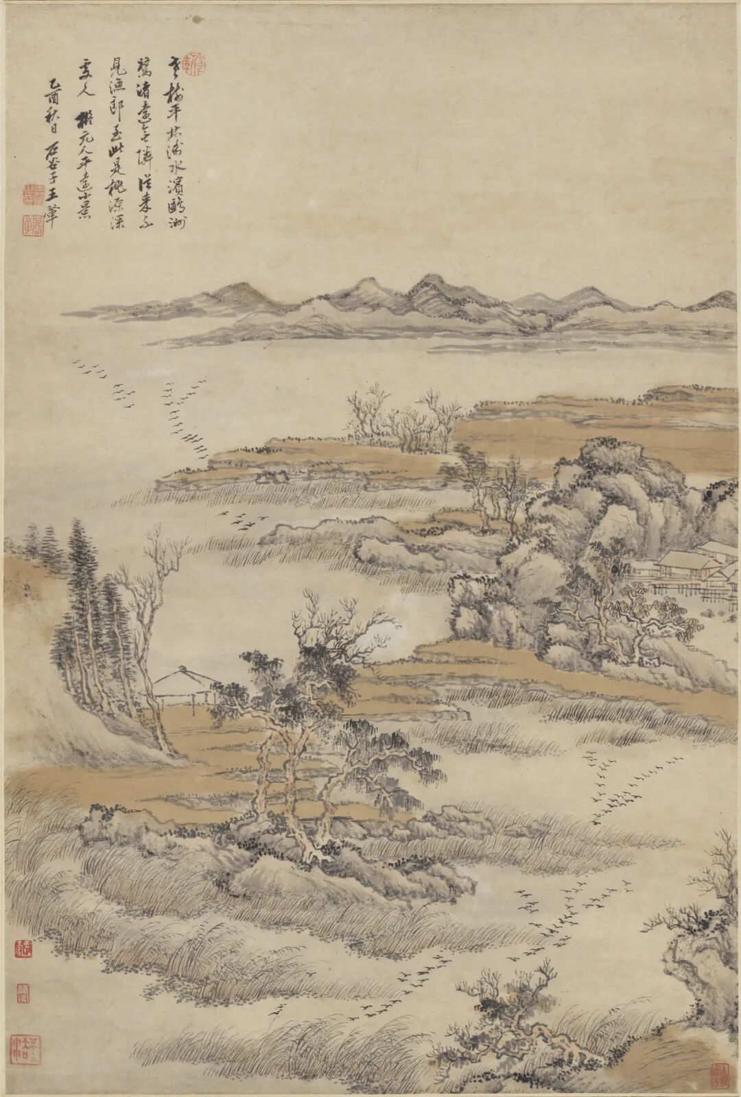 戊子(1708)初春写云林设色小景。余于客岁三冬。侍直畅春公寓。闲有暇时。薄醉消寒。便一弄笔。不觉成此数帧。因题之曰。适然集。麓台祁。