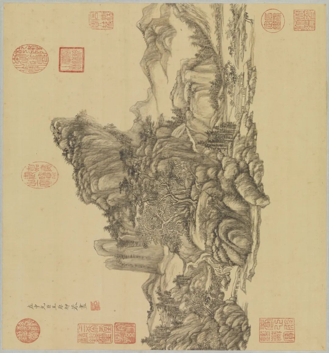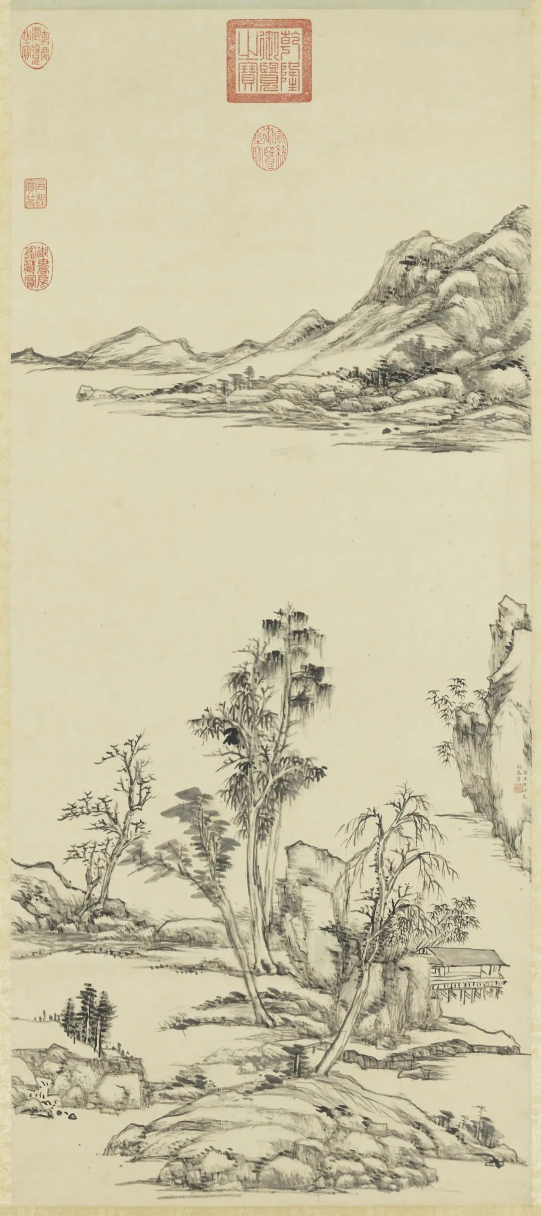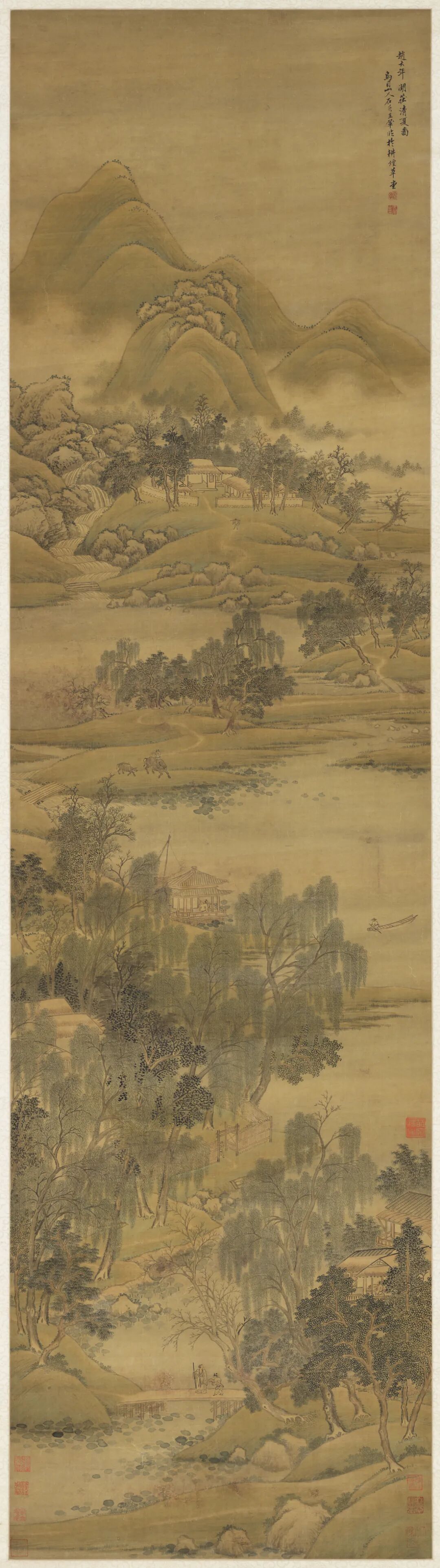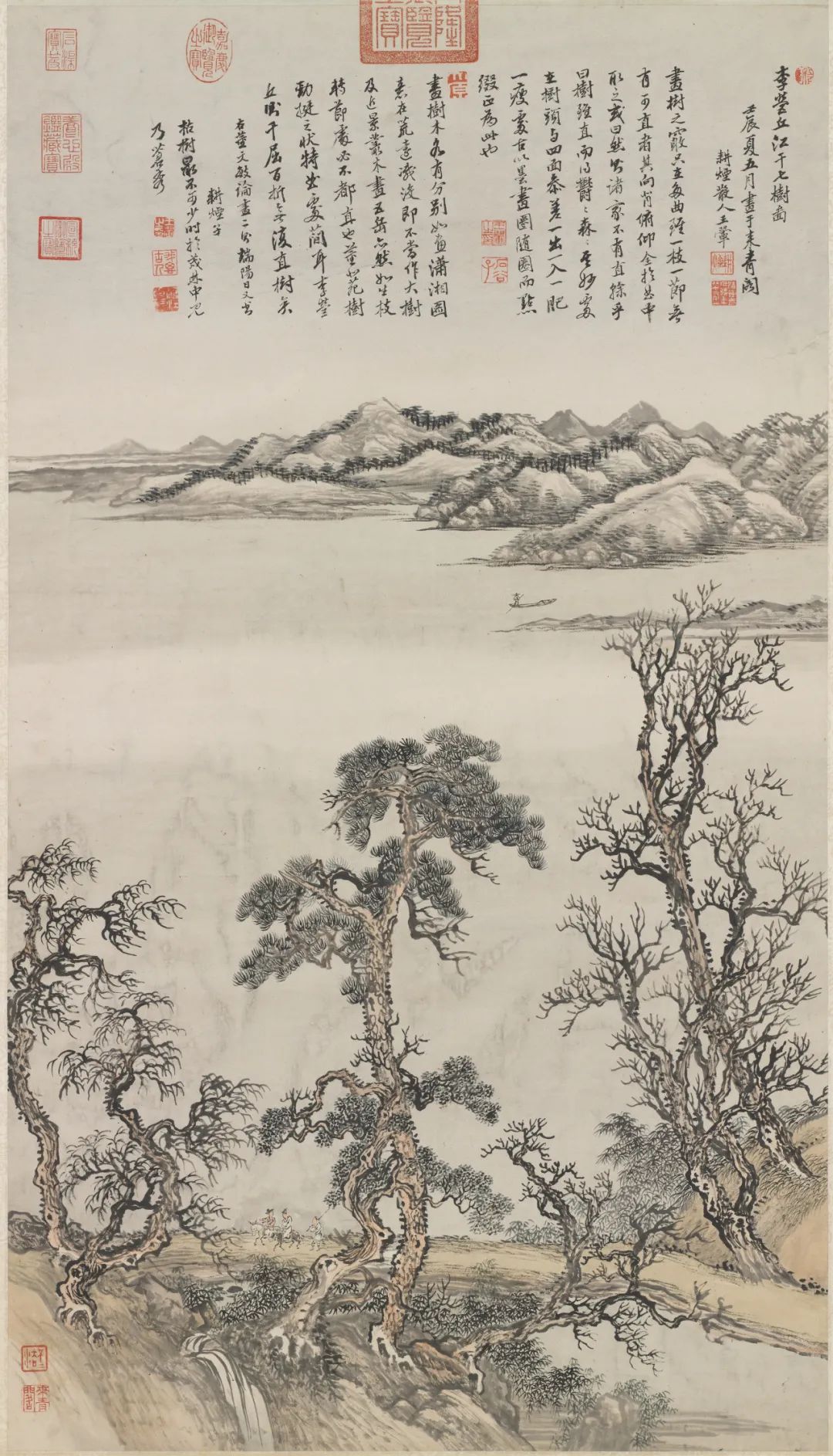 戊子(1708)初春写云林设色小景。余于客岁三冬。侍直畅春公寓。闲有暇时。薄醉消寒。便一弄笔。不觉成此数帧。因题之曰。适然集。麓台祁。