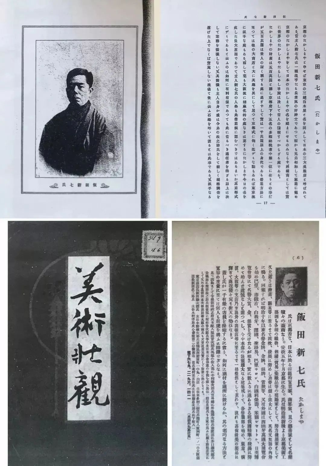 他喜好日本的文人画,《古美术大观》中刊印出其借展的画家富冈铁斋所绘仙桃寿鸟图。古陶瓷方面,同书中还有一件唐代白瓷双龙耳瓶,同样标明源自饭田新七的收藏。