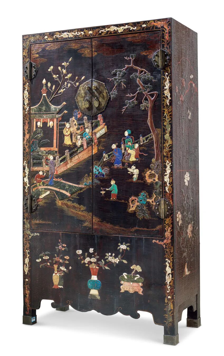 方角柜黑漆地,以青金石、绿松石、寿山石、青玉、螺钿等百宝嵌装饰,兼描金辅纹,富丽堂皇,具康熙时期漆家具风格。