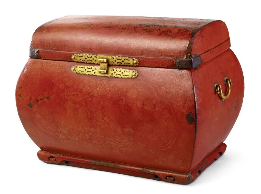 此例为甚为罕见的明代早期宫廷元宝箱,尺寸硕大,皮胎,满髹朱红漆,发色艳而沉稳,开断如蛇腹、龙鳞、丝蔓,戗金鸾凤纹、缠枝莲纹为饰。如此造型、装饰者甚为少见,兼以年代久远,以至于故宫今存箱体中亦不见此类装饰、造型者,然其漆质、纹饰均是开门的明代早期宫廷之物,可见其罕。