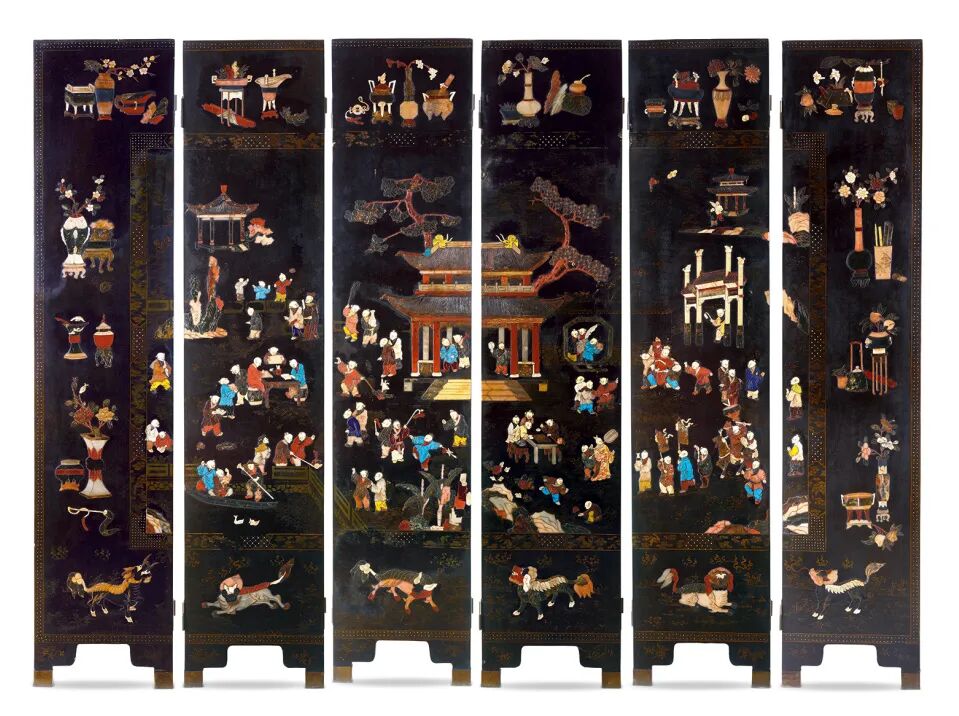 清康熙 黑漆百宝嵌婴戏图围屏(六扇)