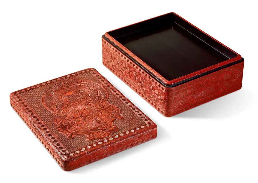 长方捧盒,转角圆润,雕红漆平整,图案繁密。盒面盖子边缘原装,故显得盖顶造型饱满。其上斜格套栀子花锦地上设圆形开光和正反如意云纹组成的异形开光,前者饰腾空飞舞的丹凤纹,后者饰波涛云龙纹。盒盖边缘、子母口处、底边皆饰回纹一周,其上为横竖条组成的方格锦地,饰折枝花卉纹。