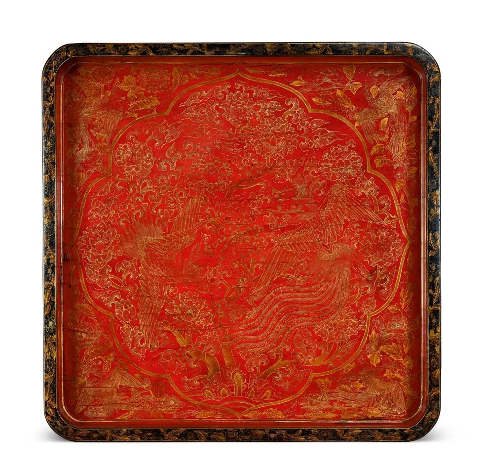 此漆盘,呈委角四方形,四周立围子,黑漆描金绘缠枝花。盘面红漆描金绘开窗凤穿牡丹纹样,大绶带鸟带着小绶带鸟展翅盘旋于牡丹花叶中,四周牡丹争妍绽放,双鸟姿态各异,一派生机盎然之景。都承盘是文房用具中一种比较特殊的实用器,俗称文房托盘,均寓一盘而承置多种物品之意。它不仅可以将小件文具归置齐整,还可以递茶端酒招待客人,兼具观赏和实用价值。