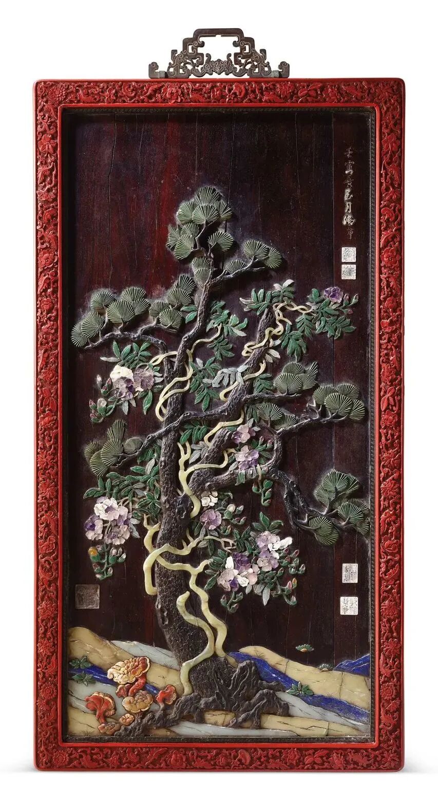 清乾隆 剔红框紫檀百宝嵌松树凌霄图挂屏