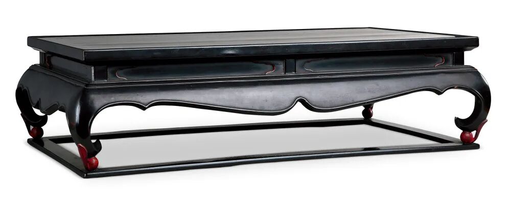 案几通体髹黑漆,造型周正规矩,几面平整,边起拦水线,束腰,鼓腿彭牙,壶门式牙板,裙边及弯足边缘均起线装饰,精细有佳。卷足,足下踩球,红漆踩球状若豆芽,给深沉的案几增添了一抹俏皮,相较于其他黑漆案几,更为精巧有趣。踩球下设方形托泥,端正轻巧。此几保存养护极好,虽传承使用年代久远,仍光润明亮,配合以精巧素雅的造型,甚为可人,是文人案头不可或缺的高档陈设。